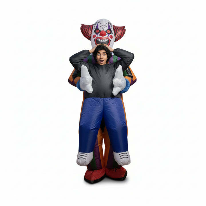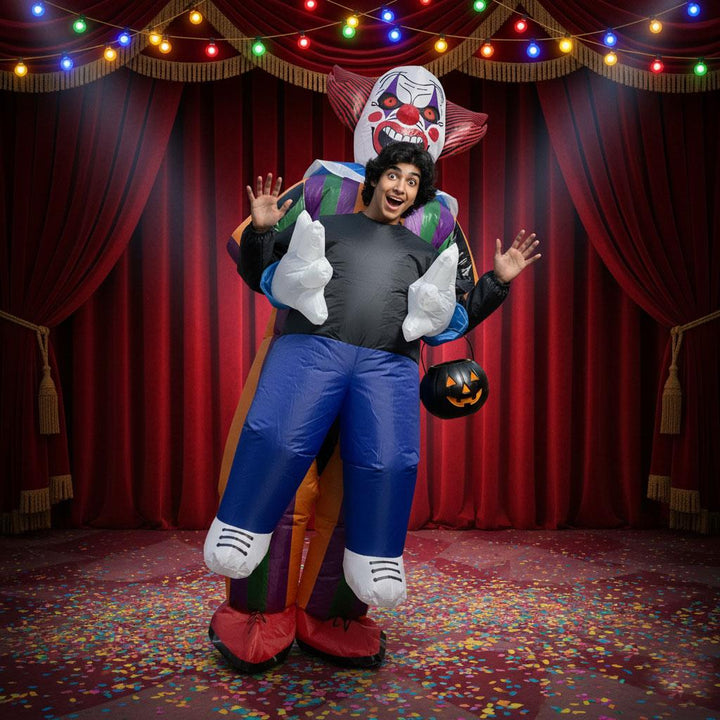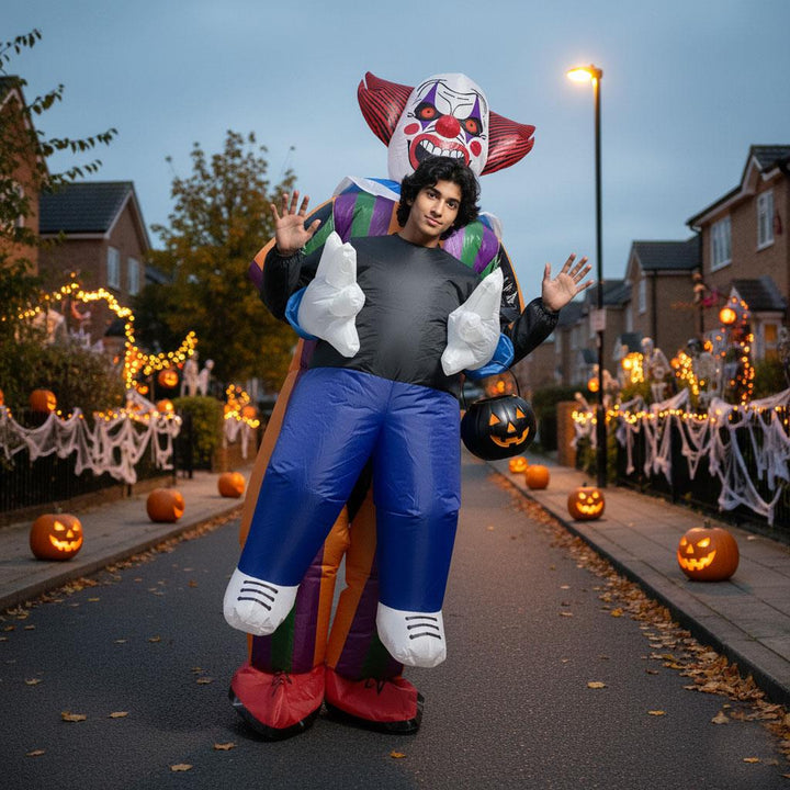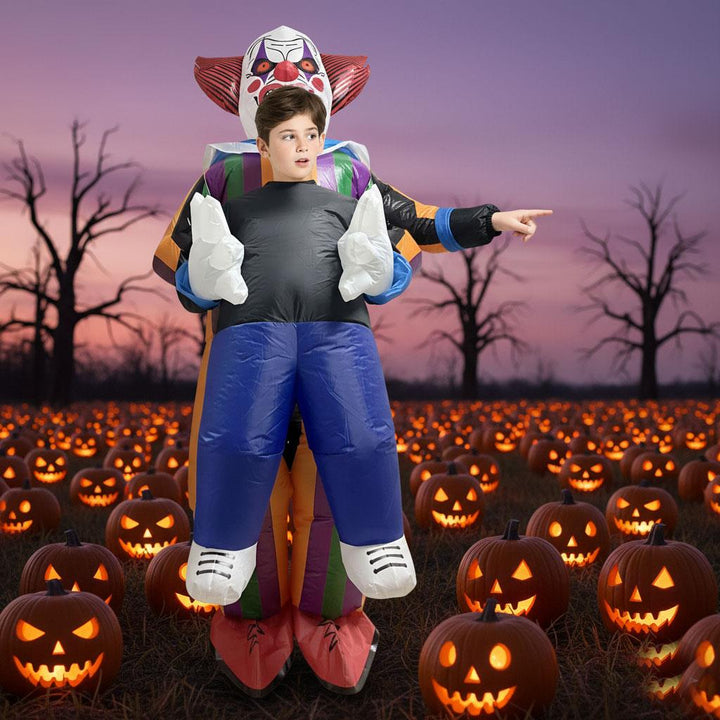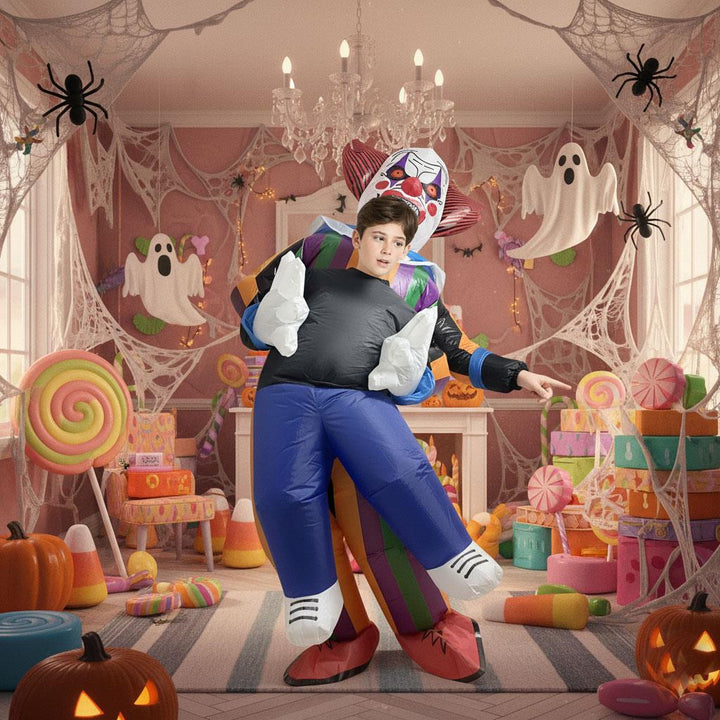 This inflatable clown costume instantly transforms kids into a larger-than-life character with bright multi-coloured panels and a comical clown face, making it a guaranteed showstopper at Halloween, school discos, parties, and themed events.