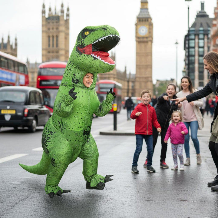 Ideal for boys and girls aged 8-12 years, this inflatable dinosaur outfit is a fantastic choice for themed parties, school events, trick-or-treating, or cosplay. Its bright green colour makes it an eye-catching gift idea for birthdays, Halloween, and Christmas dress-up fun.
