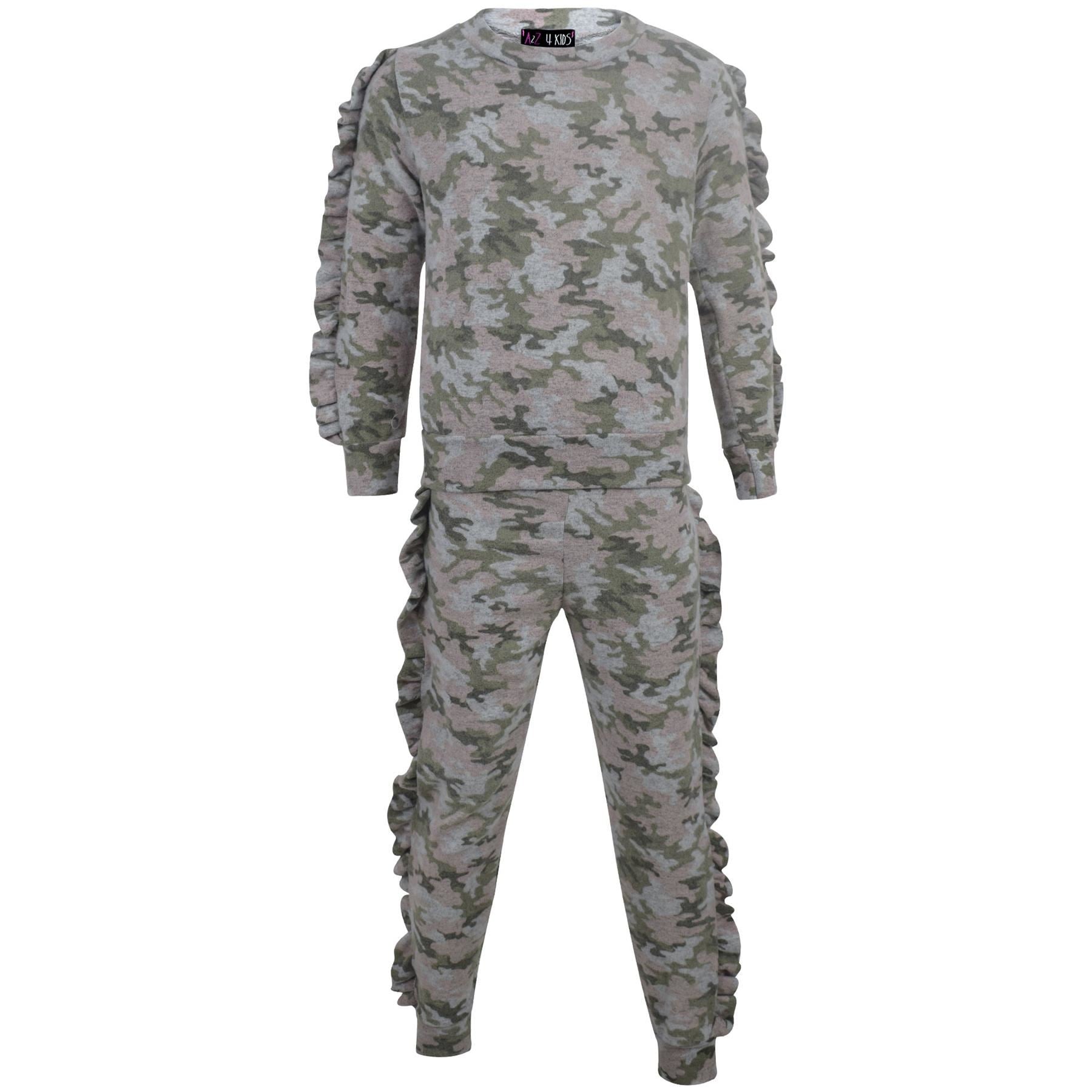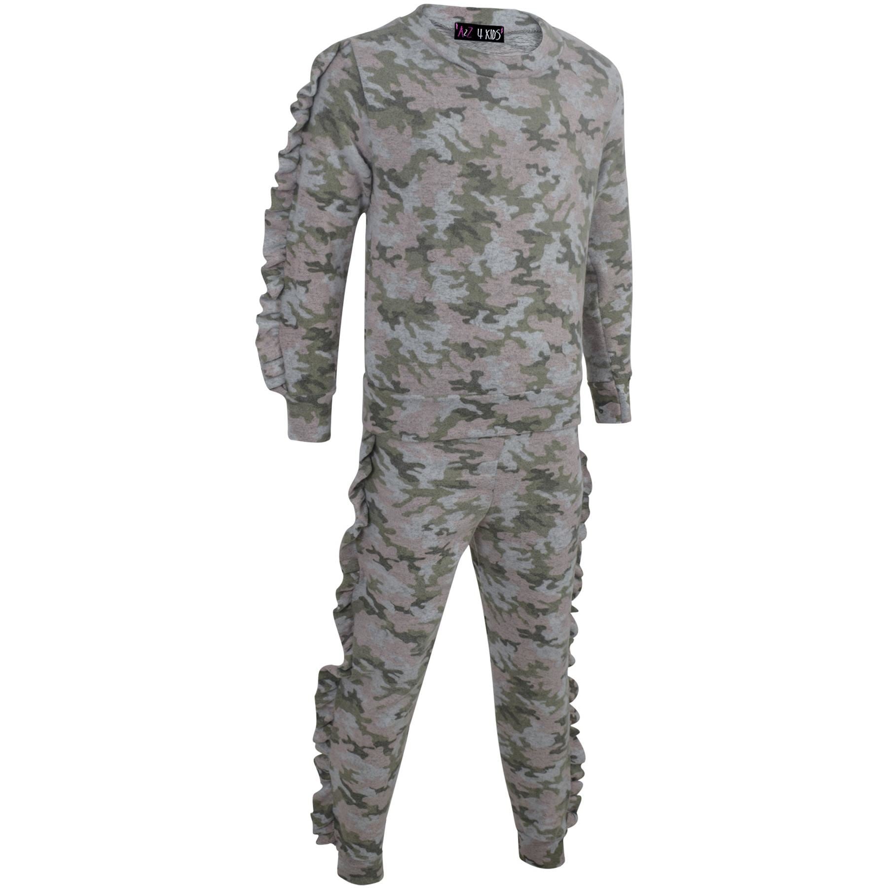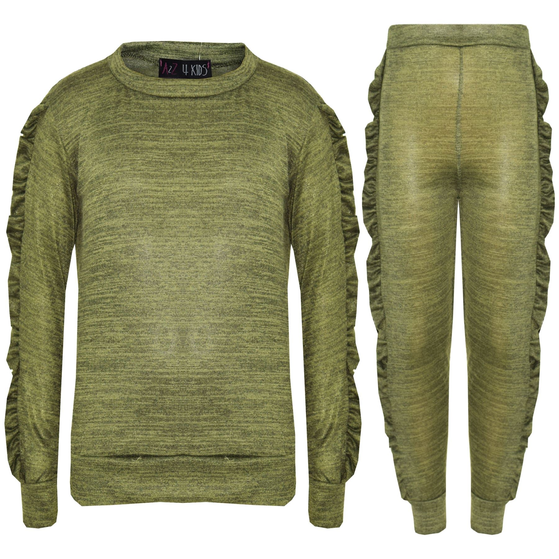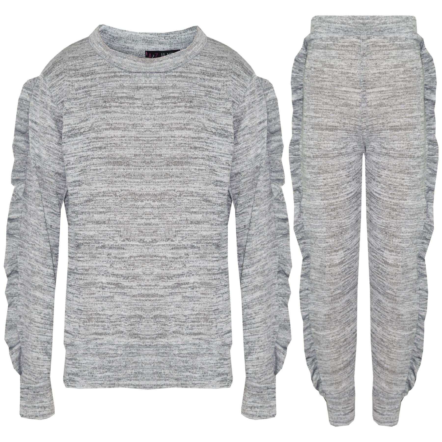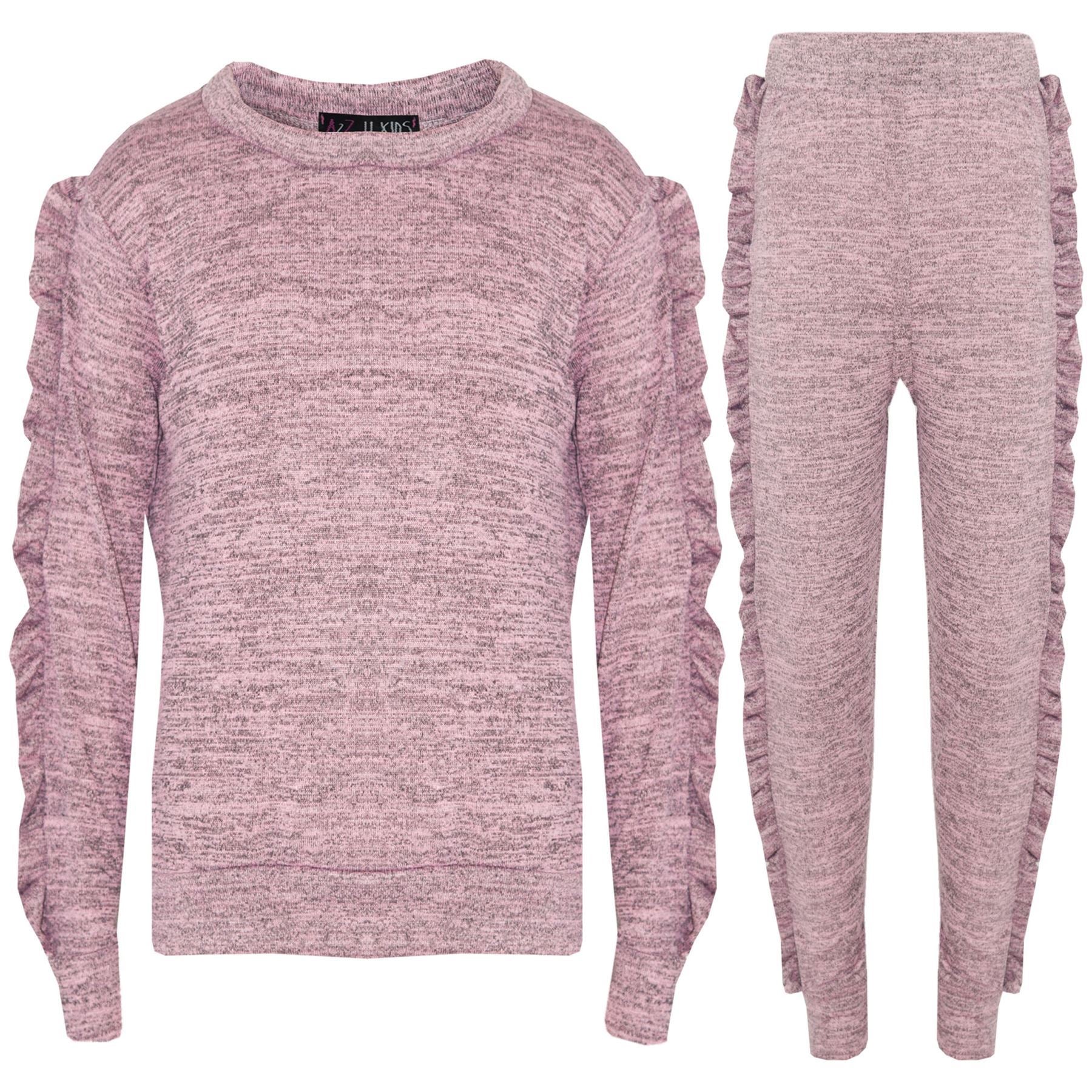 Kids Jogging Suit Girls Plain Frill Sleeve Lounge Suit Tracksuit Top Bottom 2-13