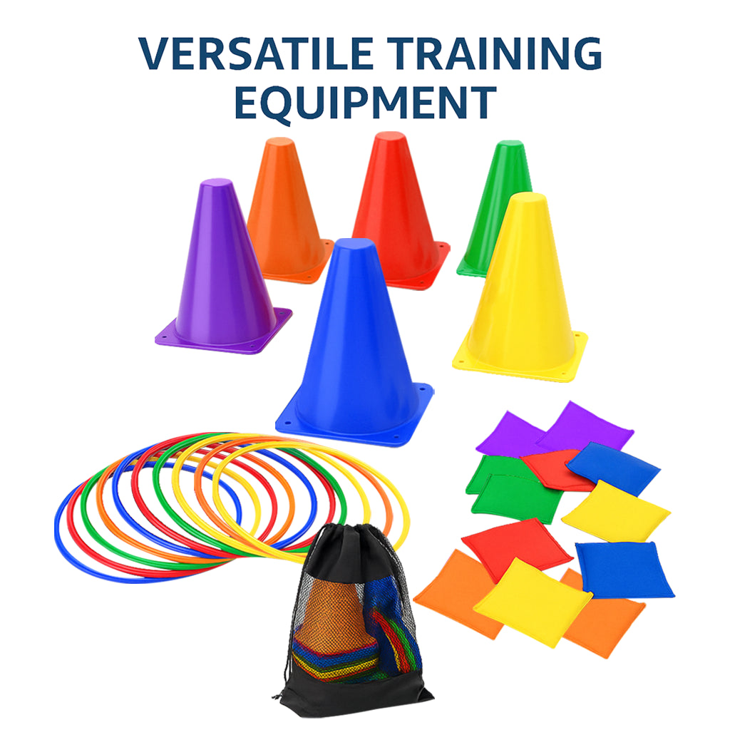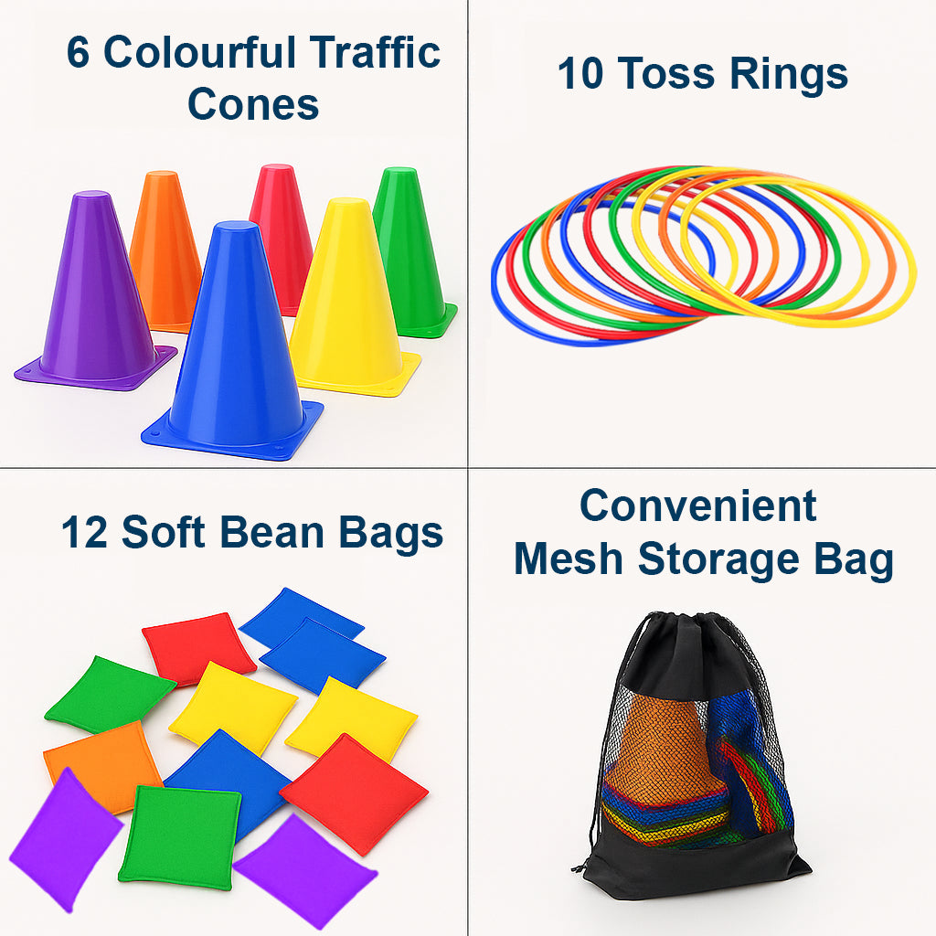 Includes 6 colourful training cones (18cm tall), 10 flexible toss rings (13cm), 12 soft bean bags, and a durable mesh storage bag. Great for garden play, sports day, and school activities.