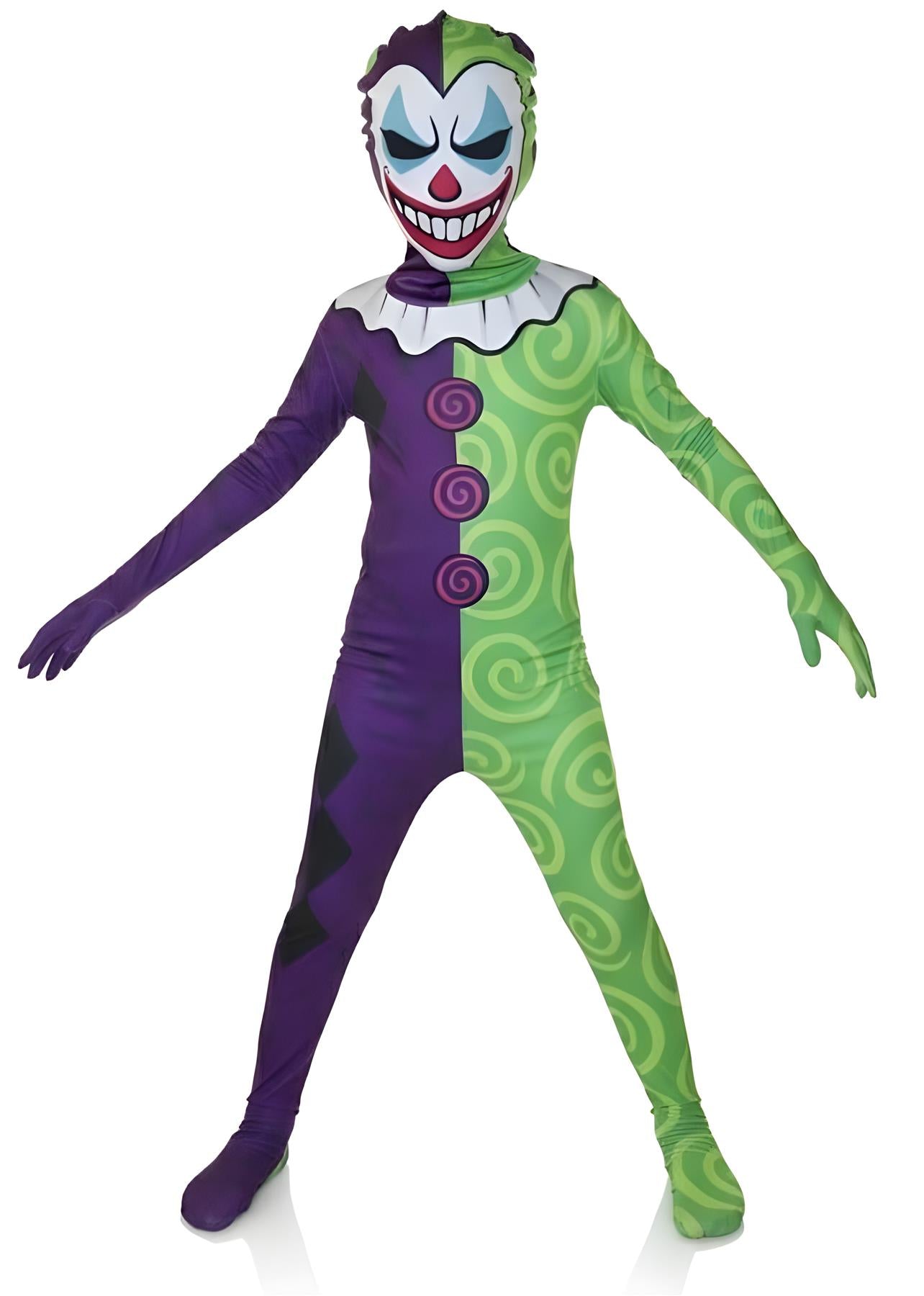 Bright half-purple, half-green swirled design with a creepy grinning clown face mask for a truly spooky look. Perfect for Halloween parties, trick or treating, school events and fancy dress days. This bold jester-style print guarantees your child stands out in eerie, fun style all night.