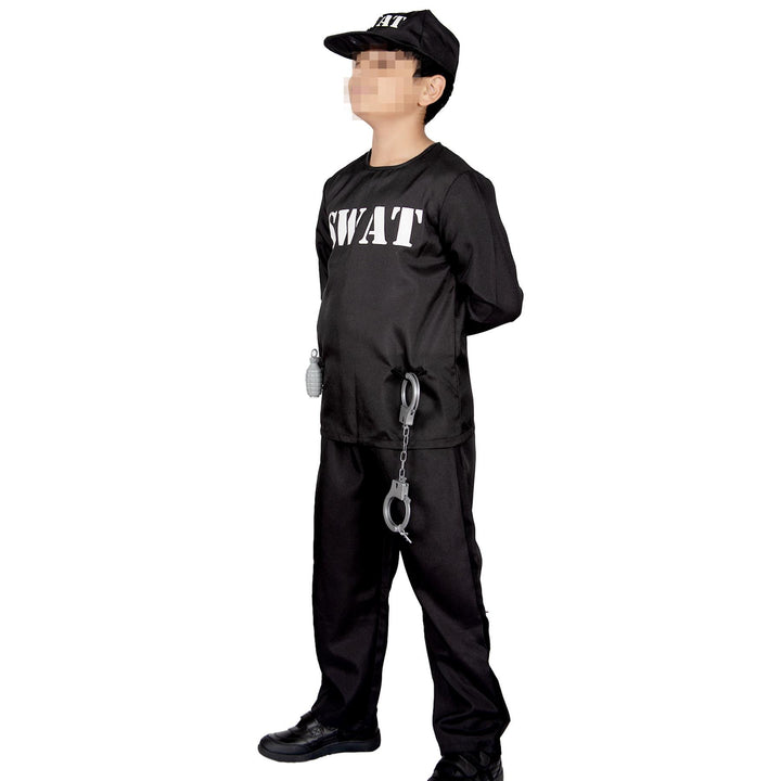 Our SWAT uniform is necessary for kids who love to protect and serve. Perfect for kids who want to dress up as American S.W.A.T Agent. It includes essential faux accessories like grenade & handcuff. It stimulates children's imagination and is excellent for SWAT themed gatherings, World Book day Role Play, Halloween parties, festivals, themed costume parties, career-themed events and everyday play.