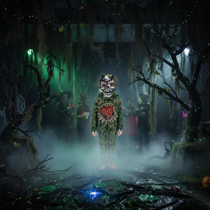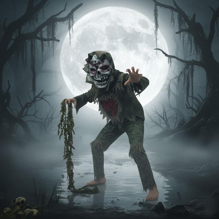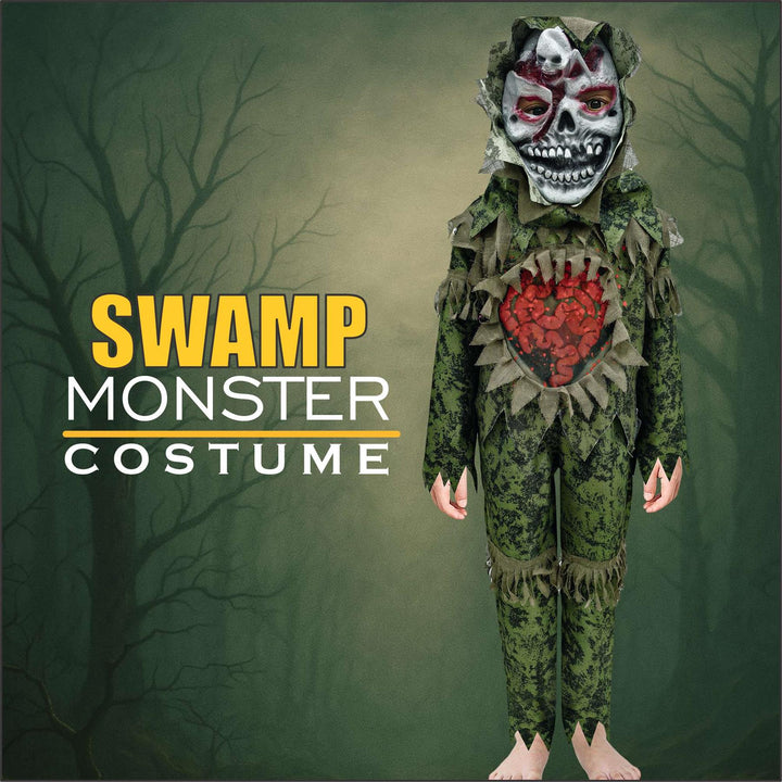 Transform your child into a terrifying swamp monster with this creepy costume set. Featuring a detailed top, trousers, and a scary mask with exposed teeth and brains, its perfect for trick-or-treat, school dress-up days, and spooky parties, making your little one stand out with a frighteningly fun look this Halloween.