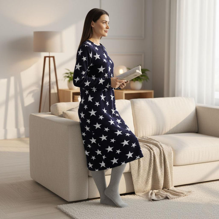 Perfect for chilly mornings quiet evenings and weekend relaxation this warm fleece nightdress offers dependable insulation to keep you comfortable at home. The lightweight yet cosy material provides the right balance of warmth without feeling heavy making it suitable for daily use through autumn winter and early spring. -