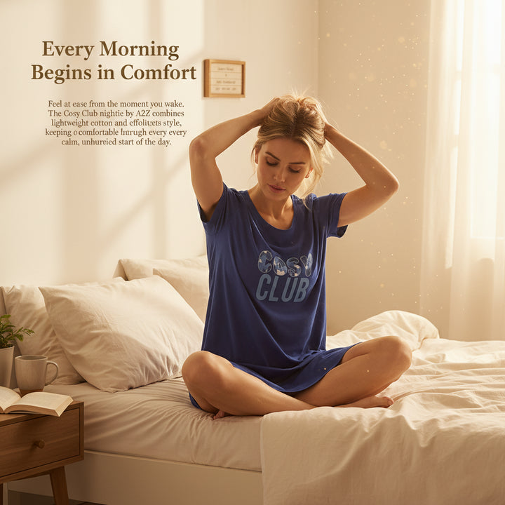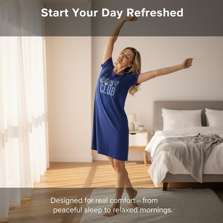 Choose from two charming designs Sweet Dreams in blossom pink and Cosy Club in navy blue. Both feature cheerful prints that add a playful and uplifting touch to your bedtime routine, making you look and feel good while you unwind. -