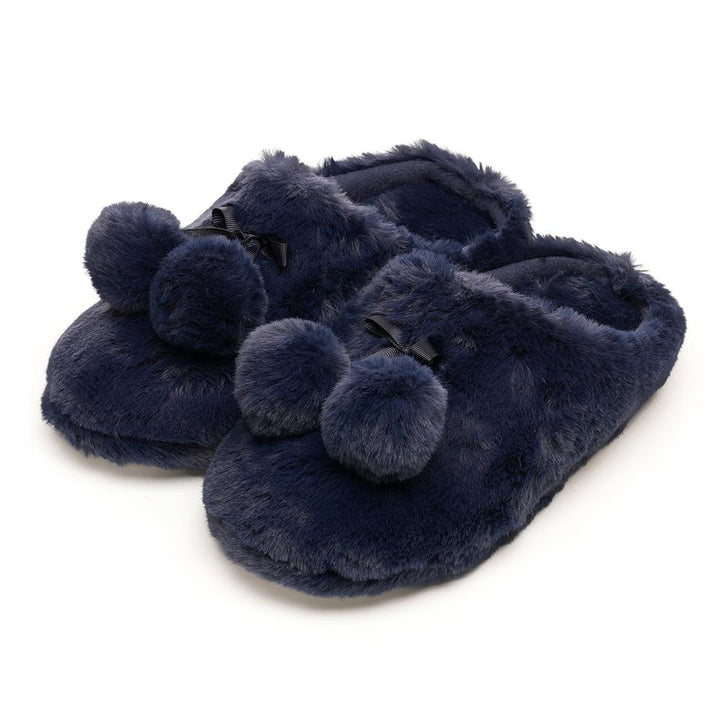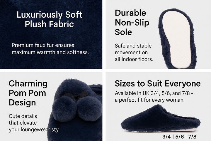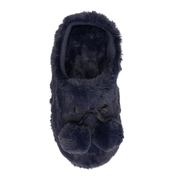 Ladies Navy Pom Pom Mule Slippers Soft Warm Plush Fluffy Indoor Non Slip Slides