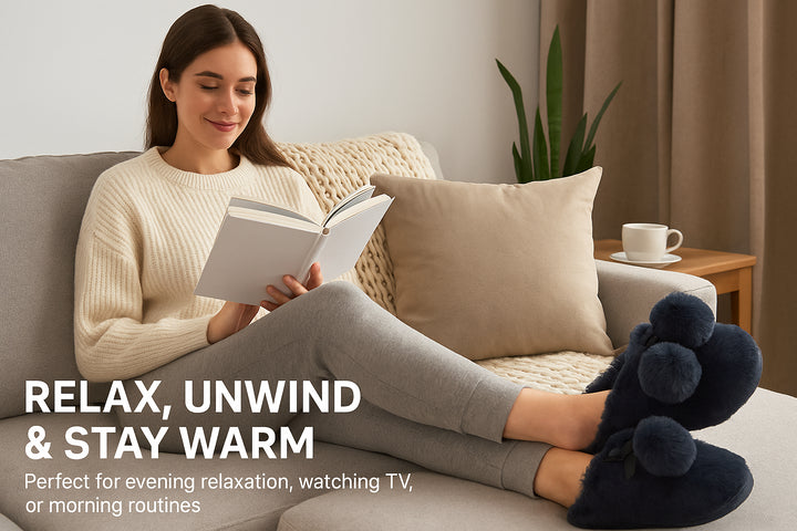 Finished with adorable fluffy pom poms and a satin bow, adding a chic, feminine touch. The navy colour complements any loungewear and makes them a beautiful winter essential. -