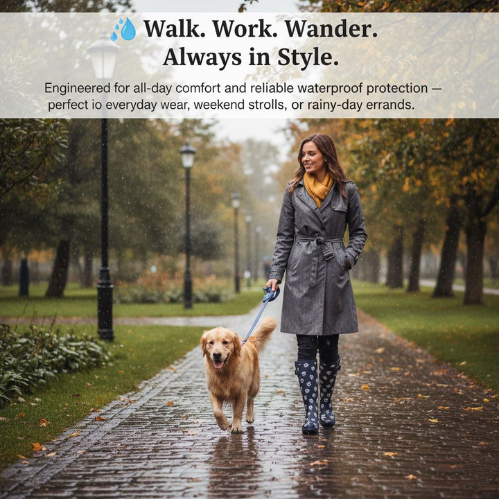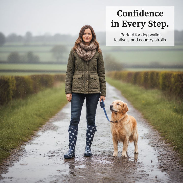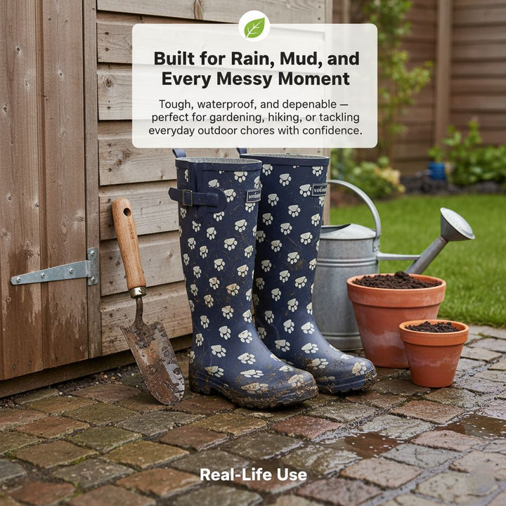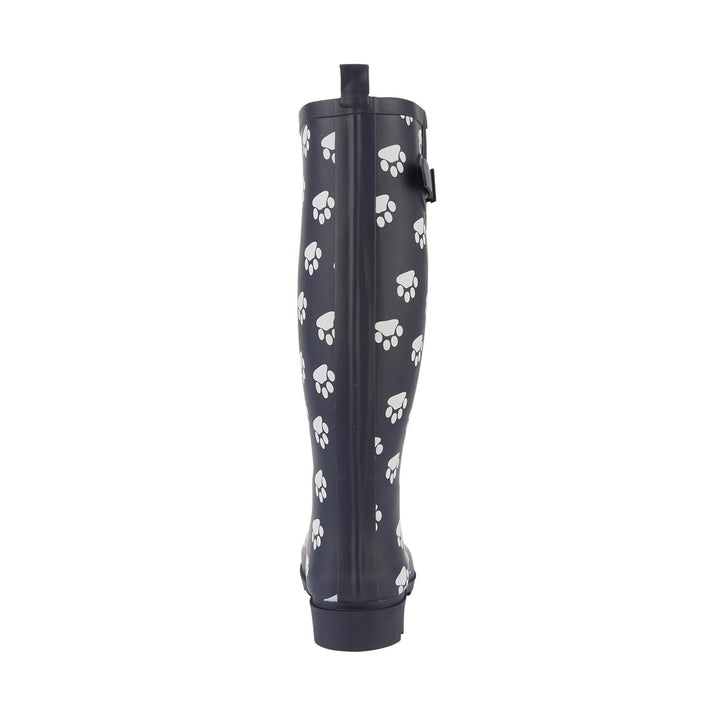 Step out in style whatever the weather with these A2Z ladies paw print wellington boots. Featuring a fun paw print design on a classic navy background, these tall wellies add charm to your rainy day wardrobe. Perfect for dog walks, festivals, gardening, or countryside adventures in any season.
