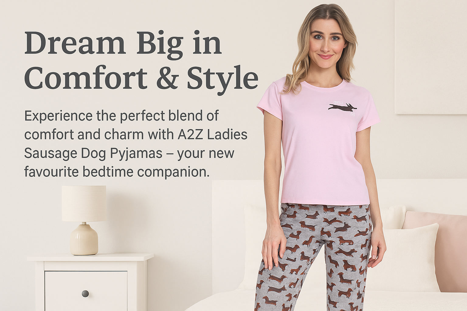 Available in Pink top and Grey bottoms featuring cute Sausage Dog pattern. Sizes from 8/10 to 20/22 offer a flattering fit for every body. Makes a perfect gift for birthdays, Christmas, or Mother Day a cosy choice for dog lovers and comfort seekers alike.