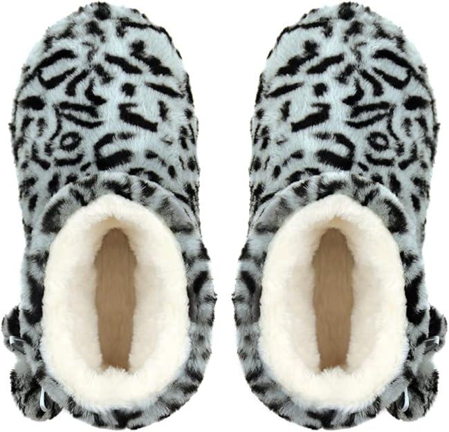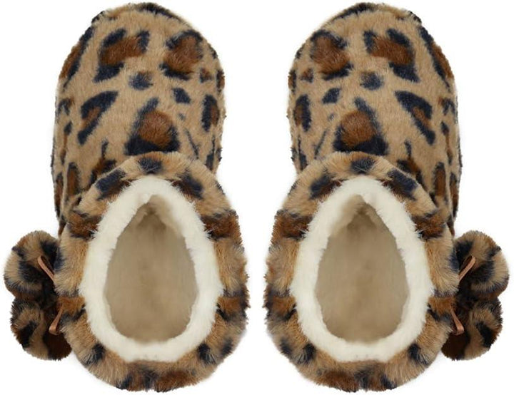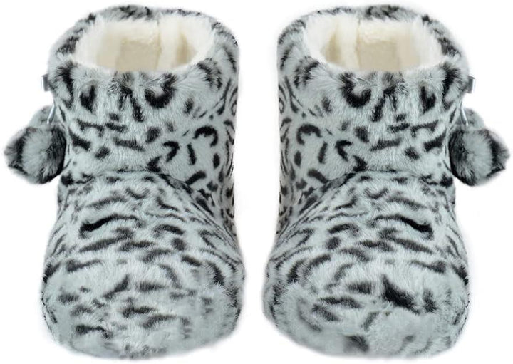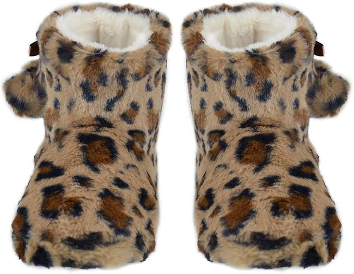 These stylish leopard print womens booties are crafted from premium, vegan-friendly faux fur, offering both fashion and sustainability. Lined with a luxuriously soft fabric, they feature a convenient slip-on design for effortless wear. The plush memory foam insole ensures exceptional comfort, while the fleecy-lined leopard pattern and cozy fur collar add a touch of warmth and sophistication.