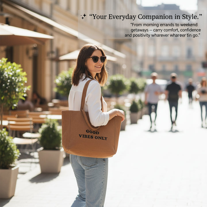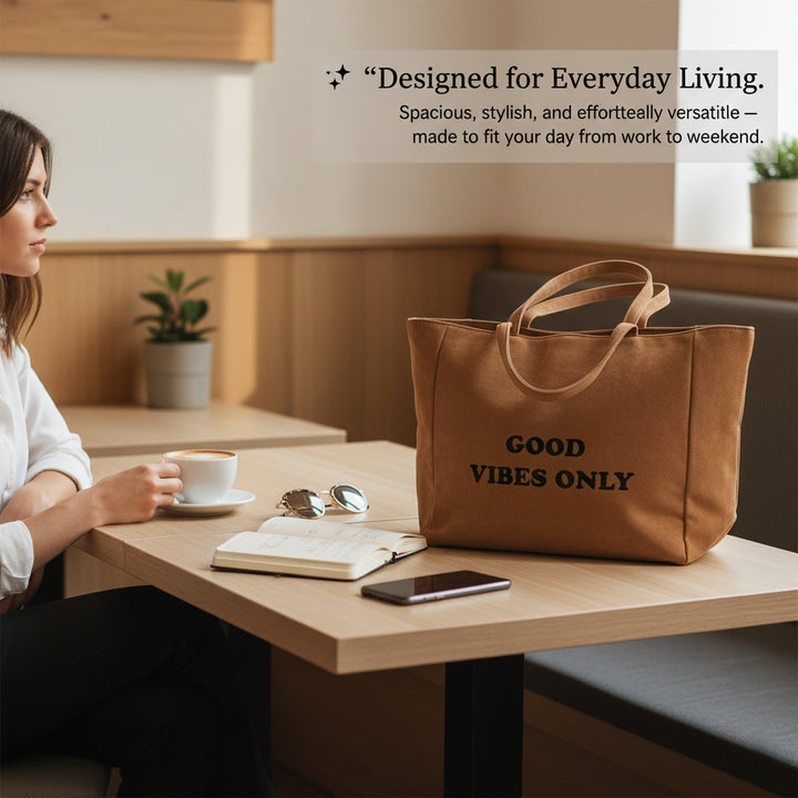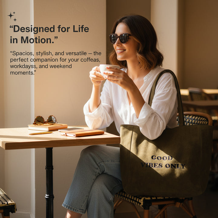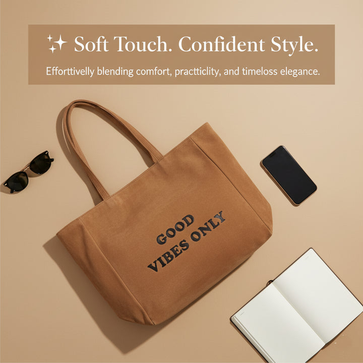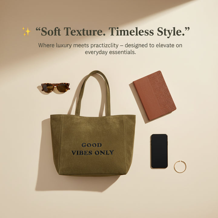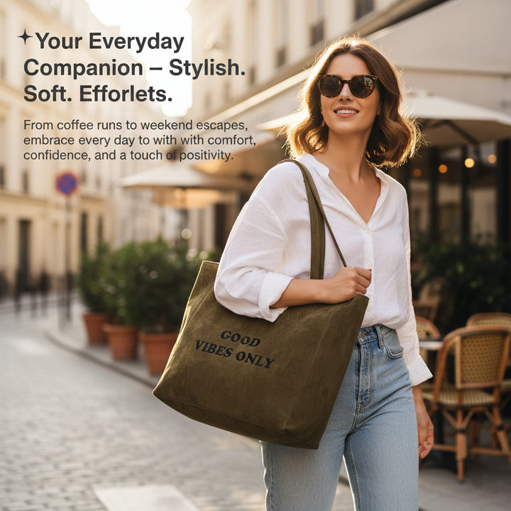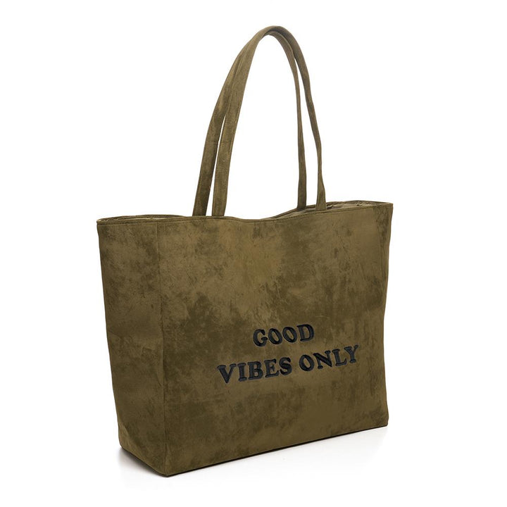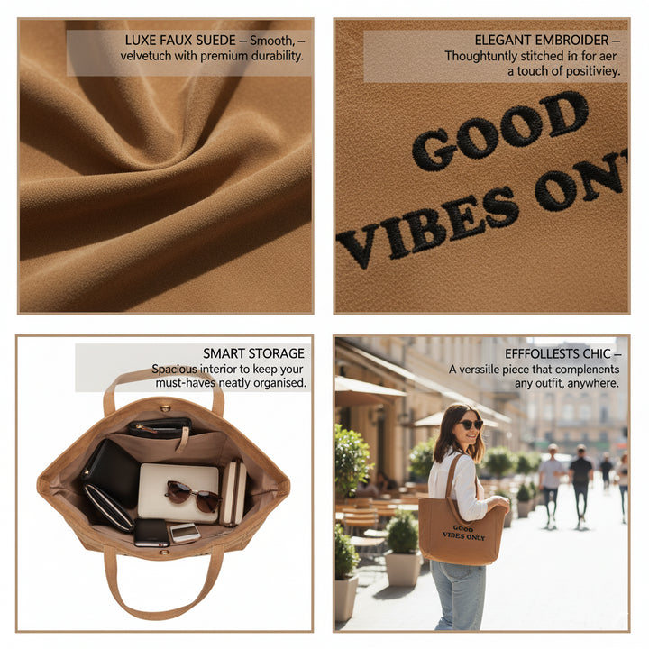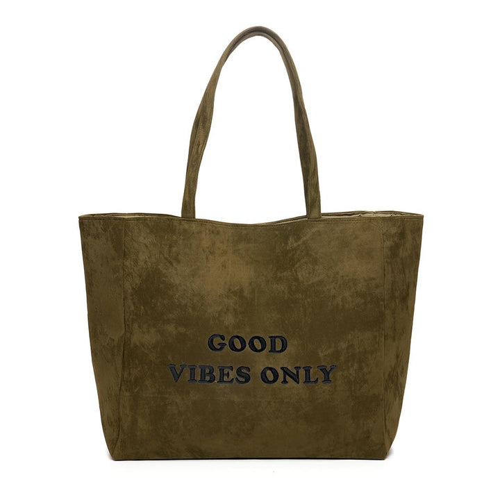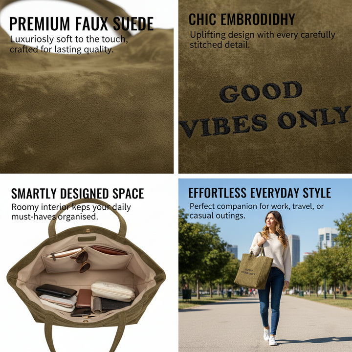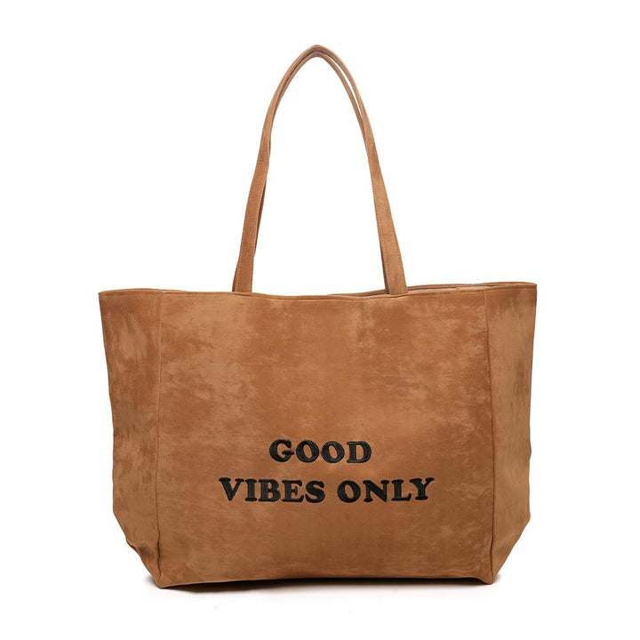 Crafted from luxuriously soft faux suede for a rich texture and timeless appeal. This elegant tote features a chic embroidered ‘GOOD VIBES ONLY’ slogan that adds a modern, uplifting touch to your daily style – ideal for work, travel, or casual outings.