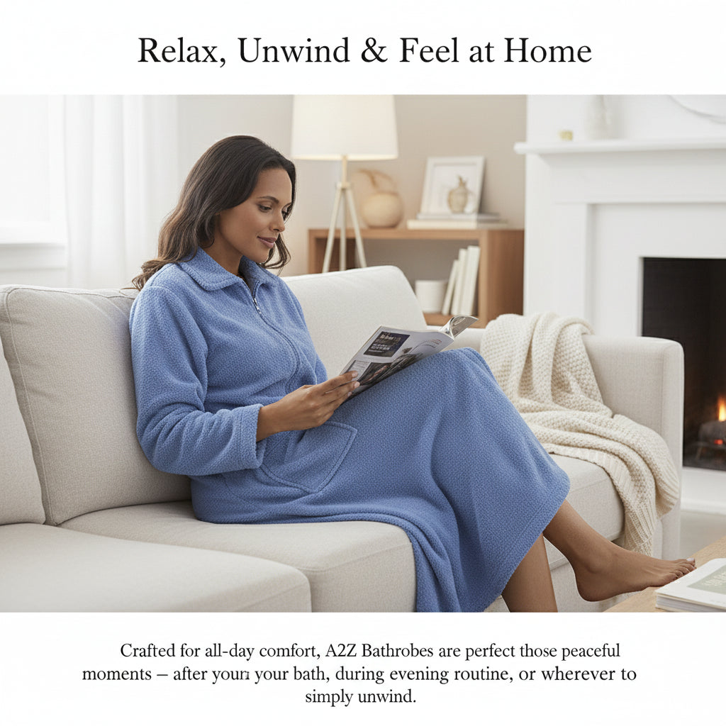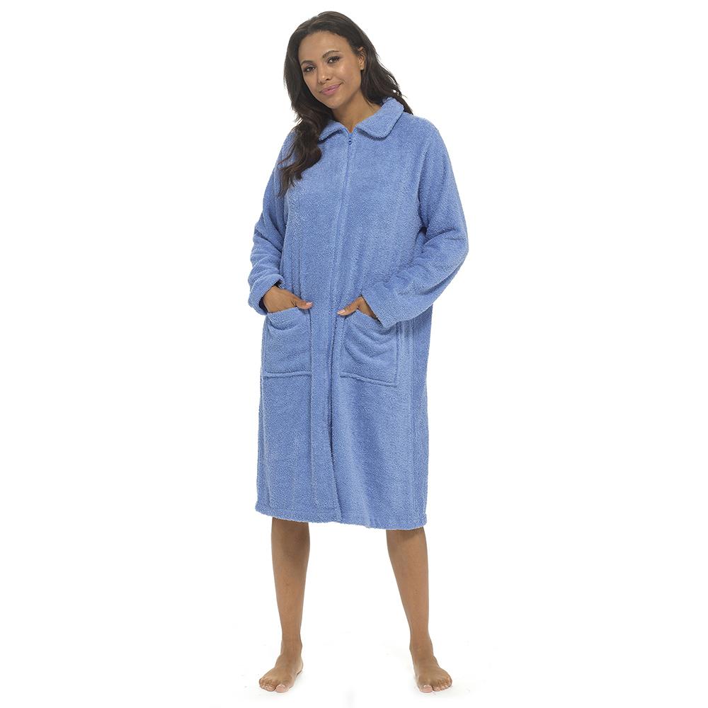 Ladies Towelling Bathrobe Front Zip Dressing Gown Long Sleeves & Deep Pockets