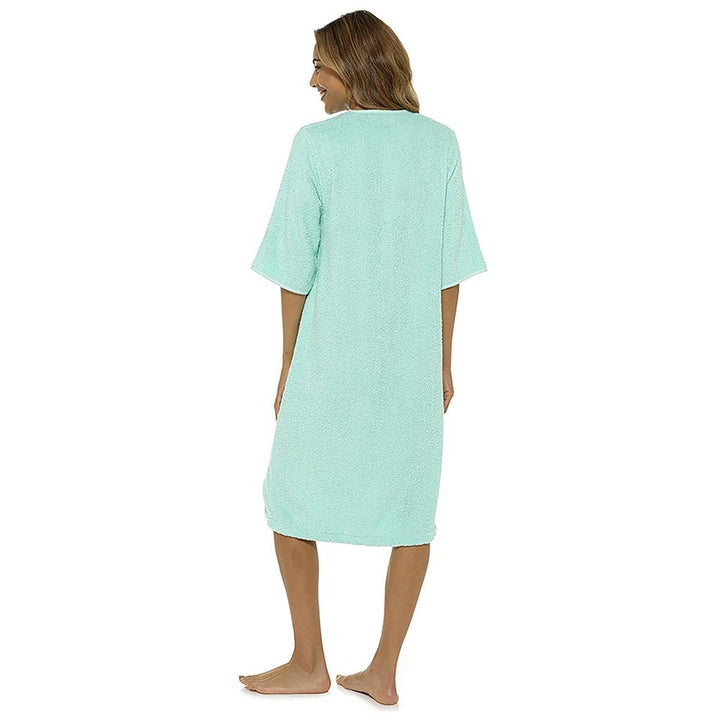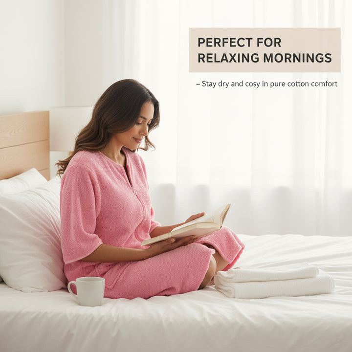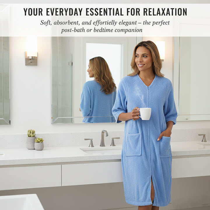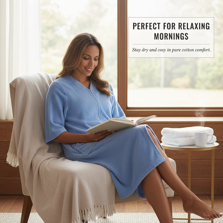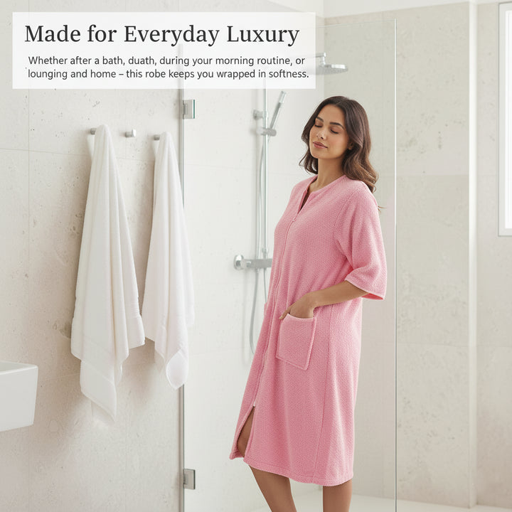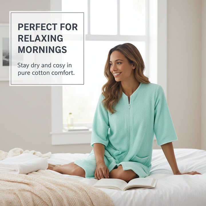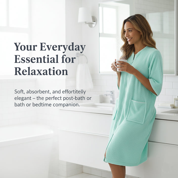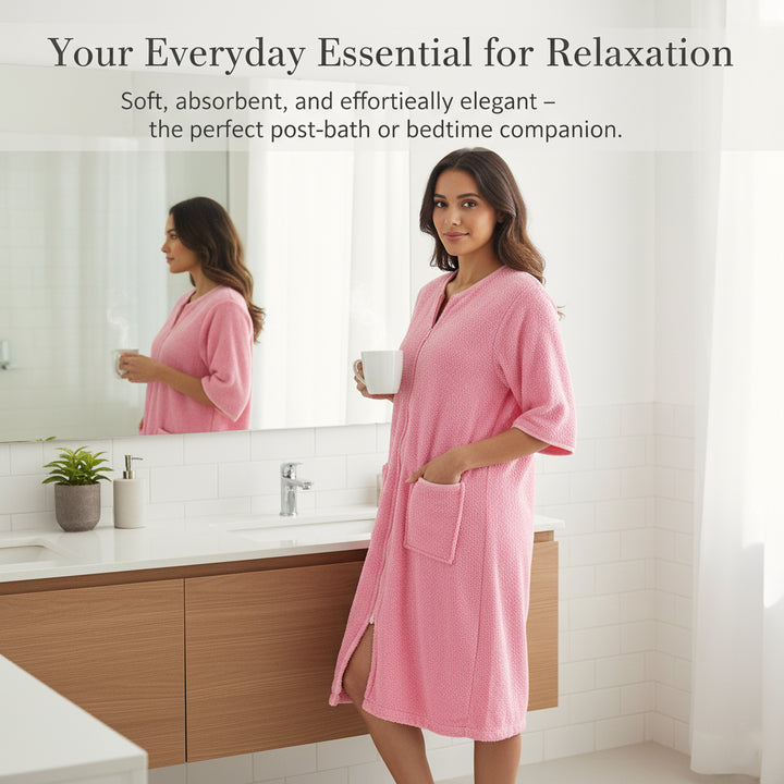 Designed with a smooth YKK front zip for effortless wear and removal. The knee-length style and relaxed fit ensure ease of movement while staying modest and comfortable. Perfect for daily routines, spa days, and holidays easy to slip on after a refreshing shower. -
