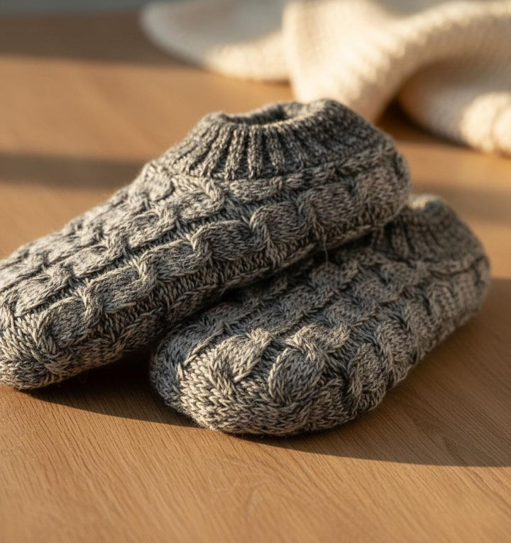 Made from a premium blend of 91% acrylic, 5% nylon, 3% polyester, and 1% elastane to ensure breathability, flexibility, and shape retention. The thick cable knit exterior is strong and hard-wearing, while the stretchy cuff offers a snug yet gentle fit that prevents slipping off the feet. -