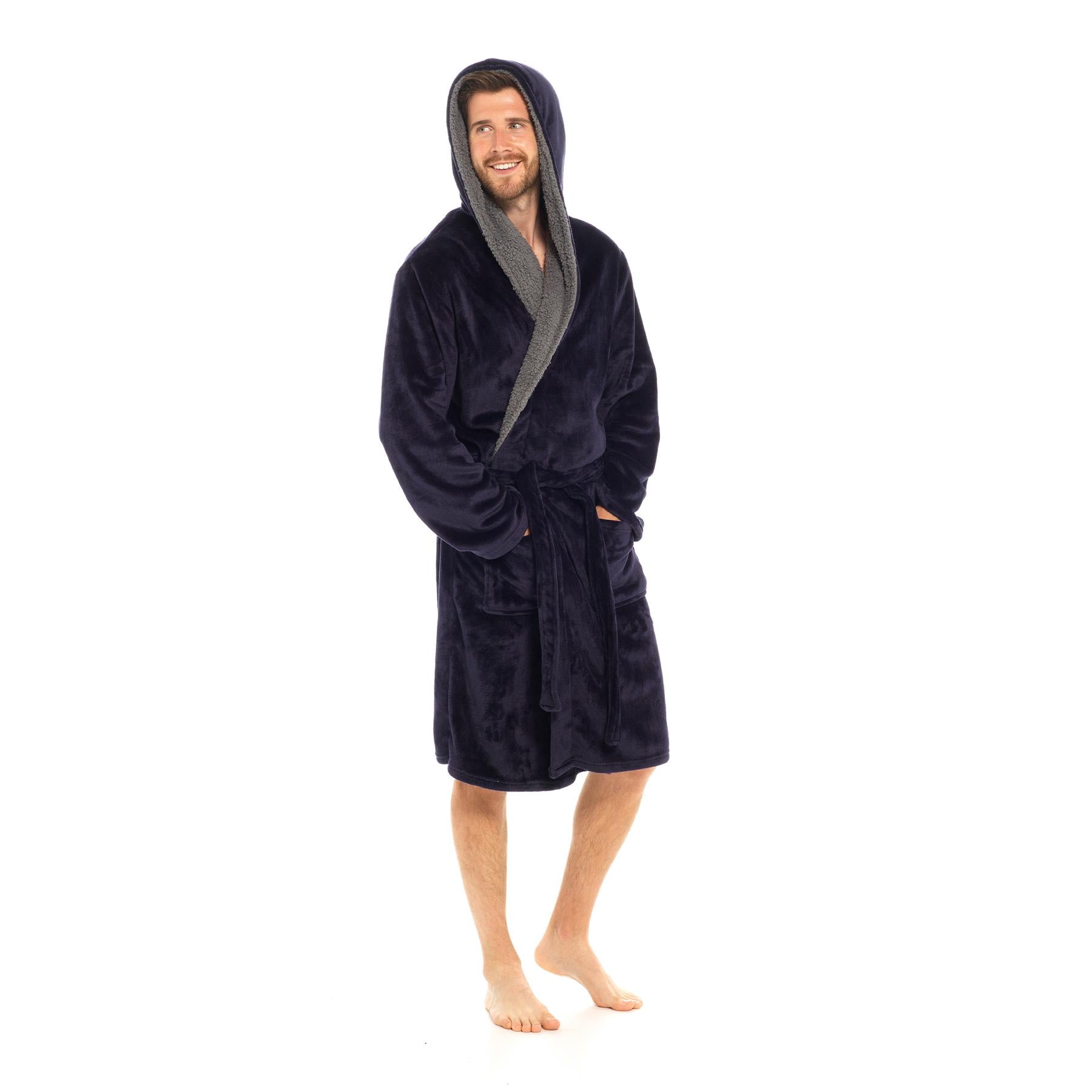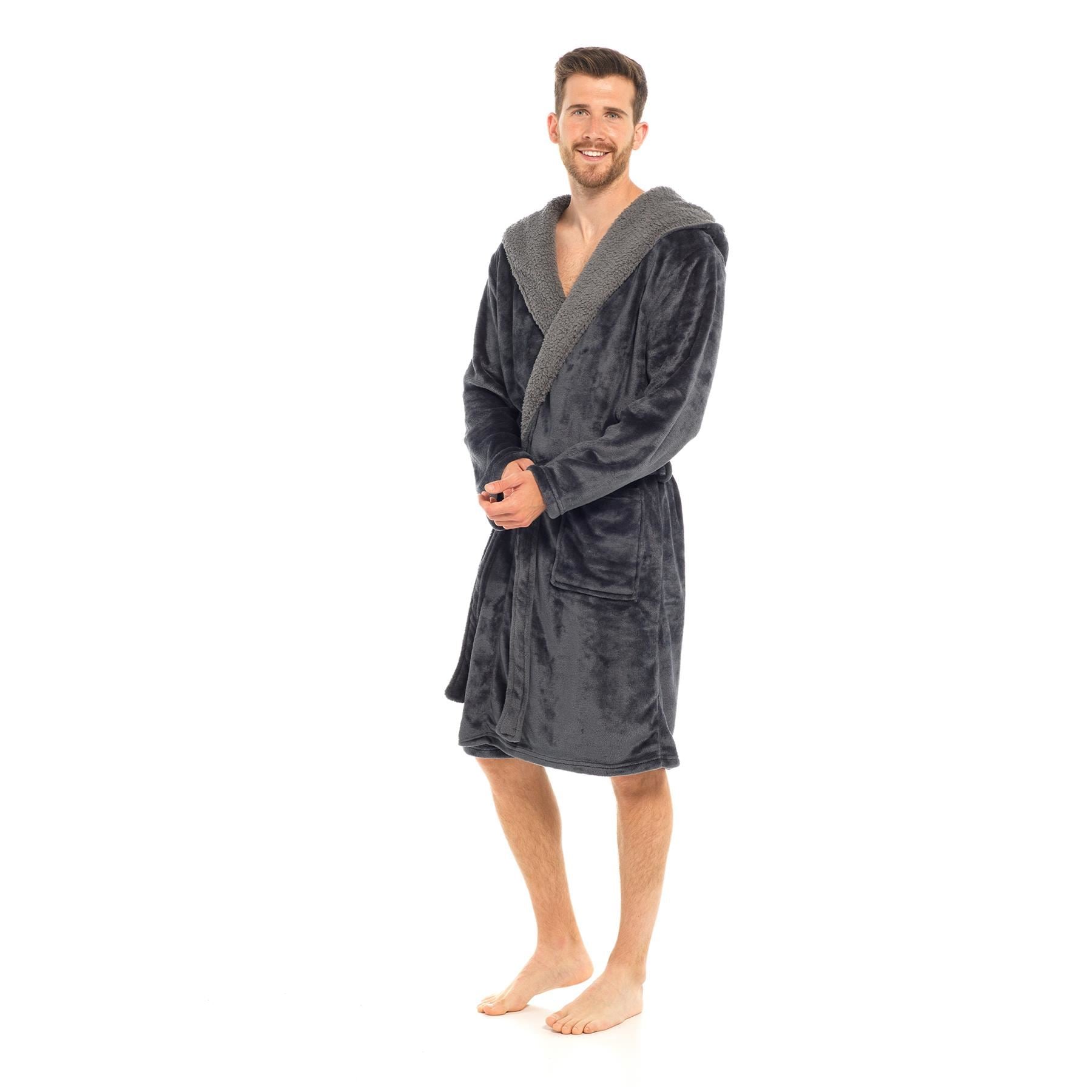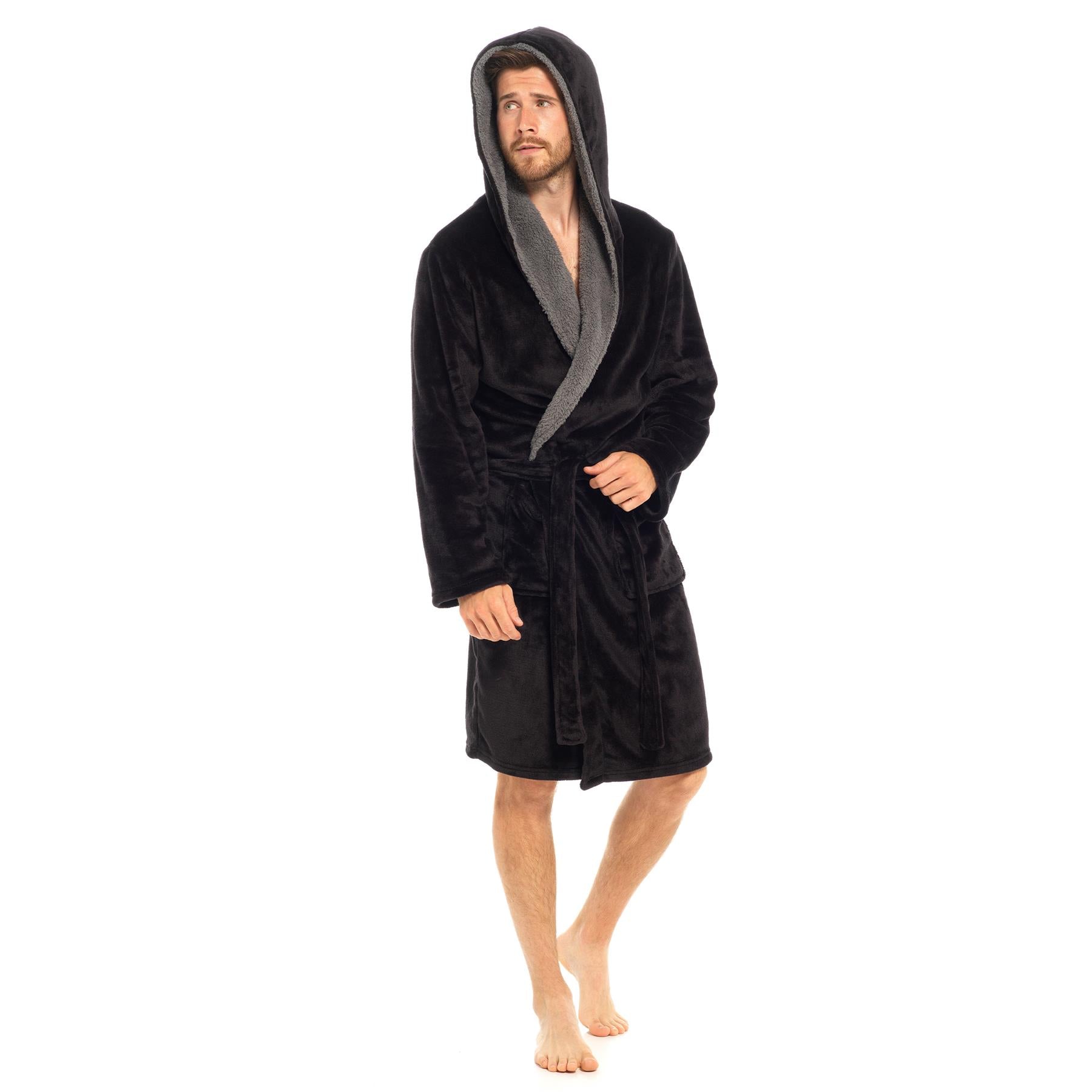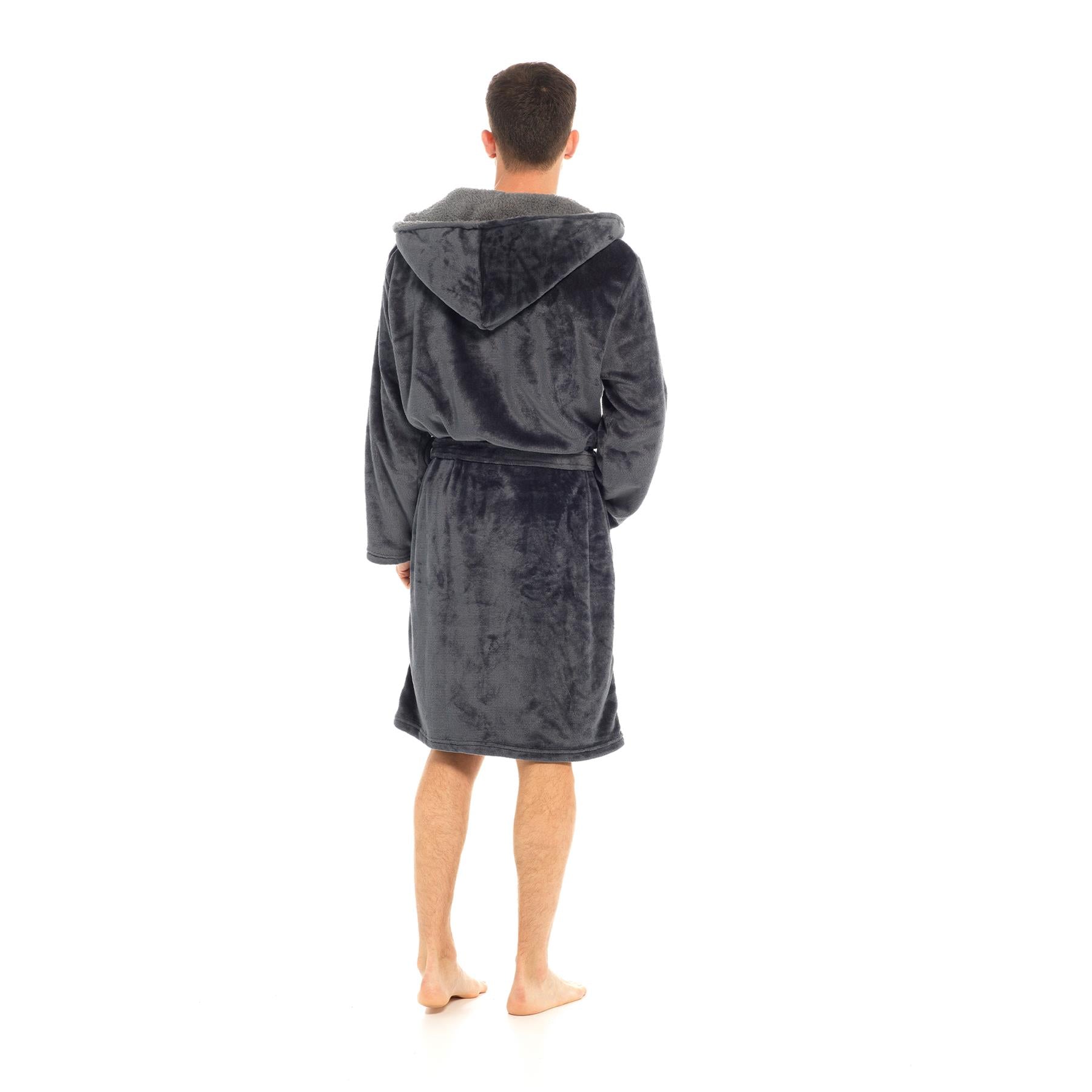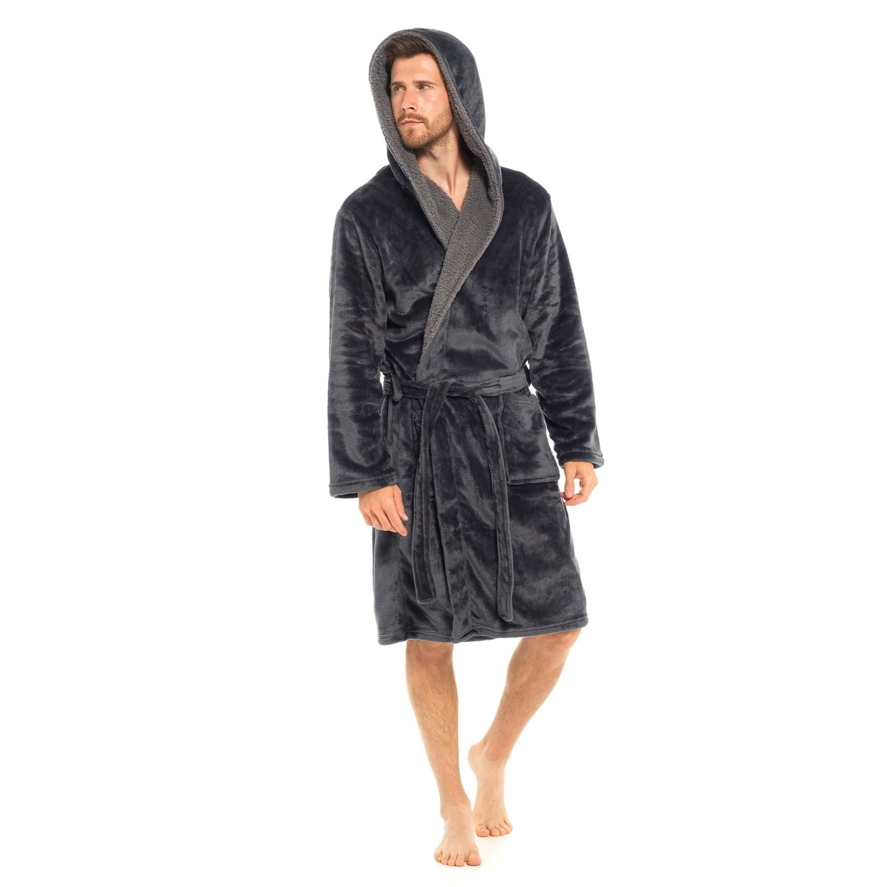 Mens Flannel Fleece Hooded Dressing Gown Sherpa Lined Robe with Belt & Pockets