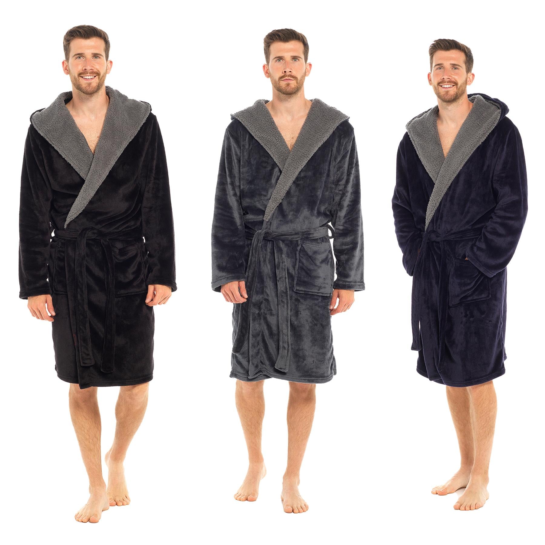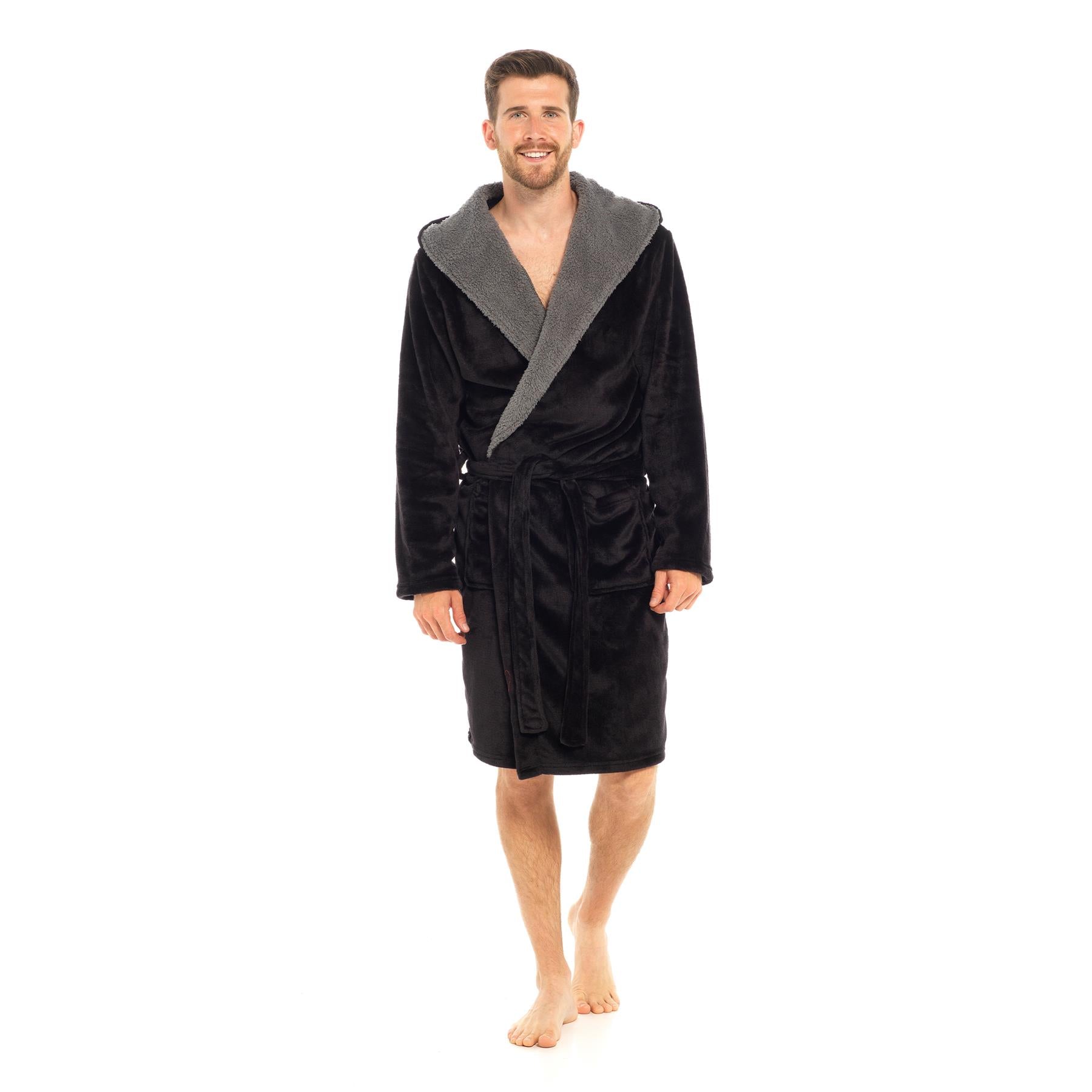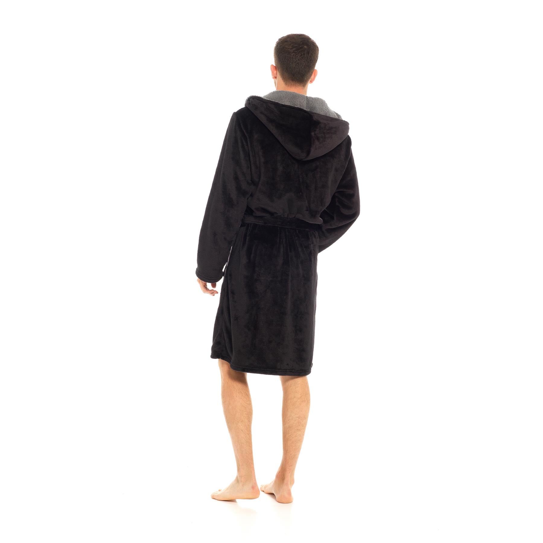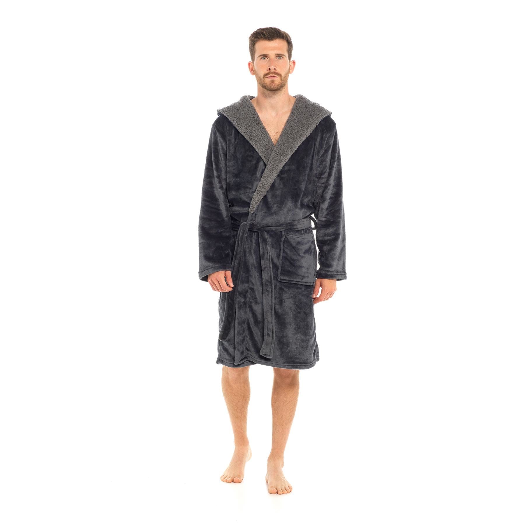 Mens Flannel Fleece Hooded Dressing Gown Sherpa Lined Robe with Belt & Pockets