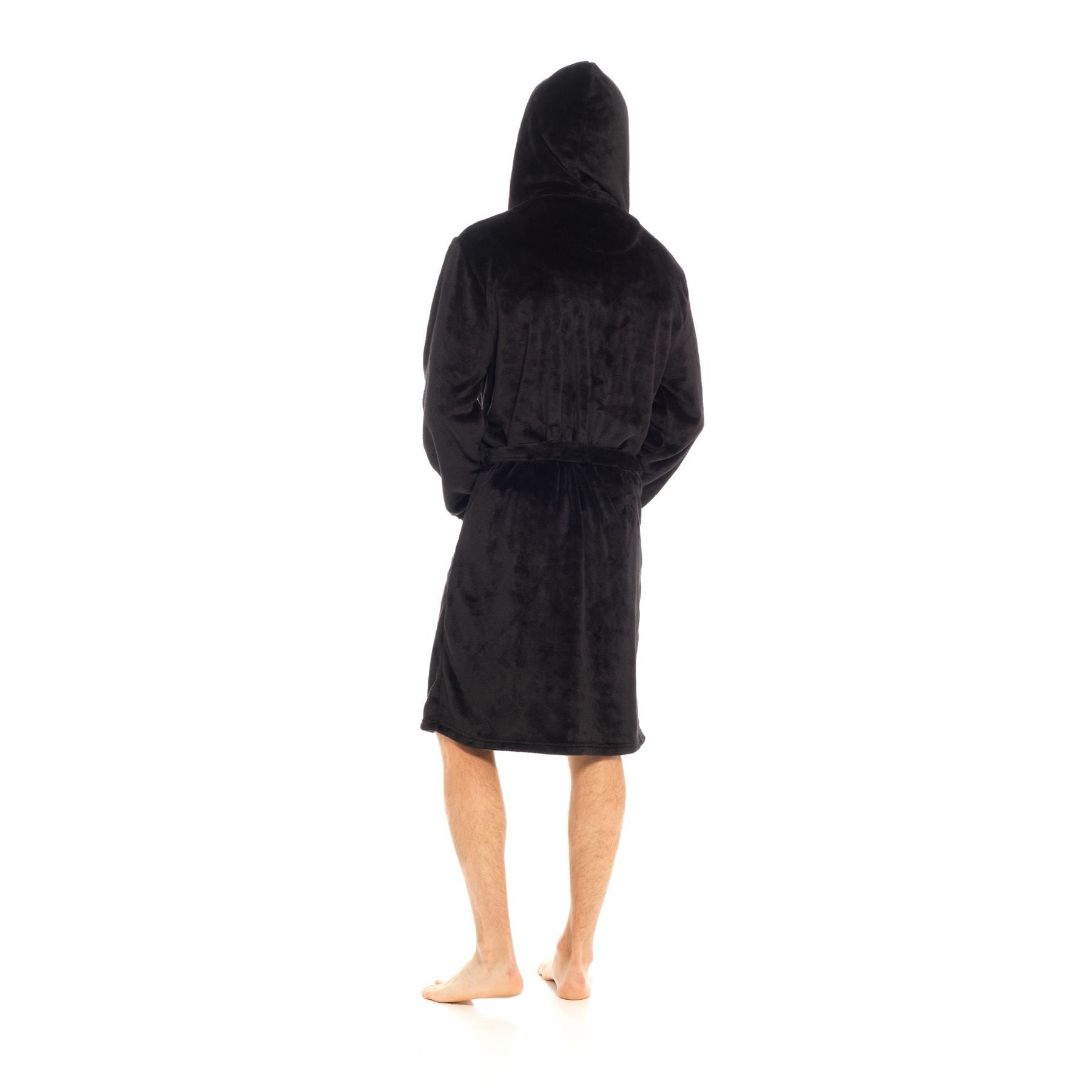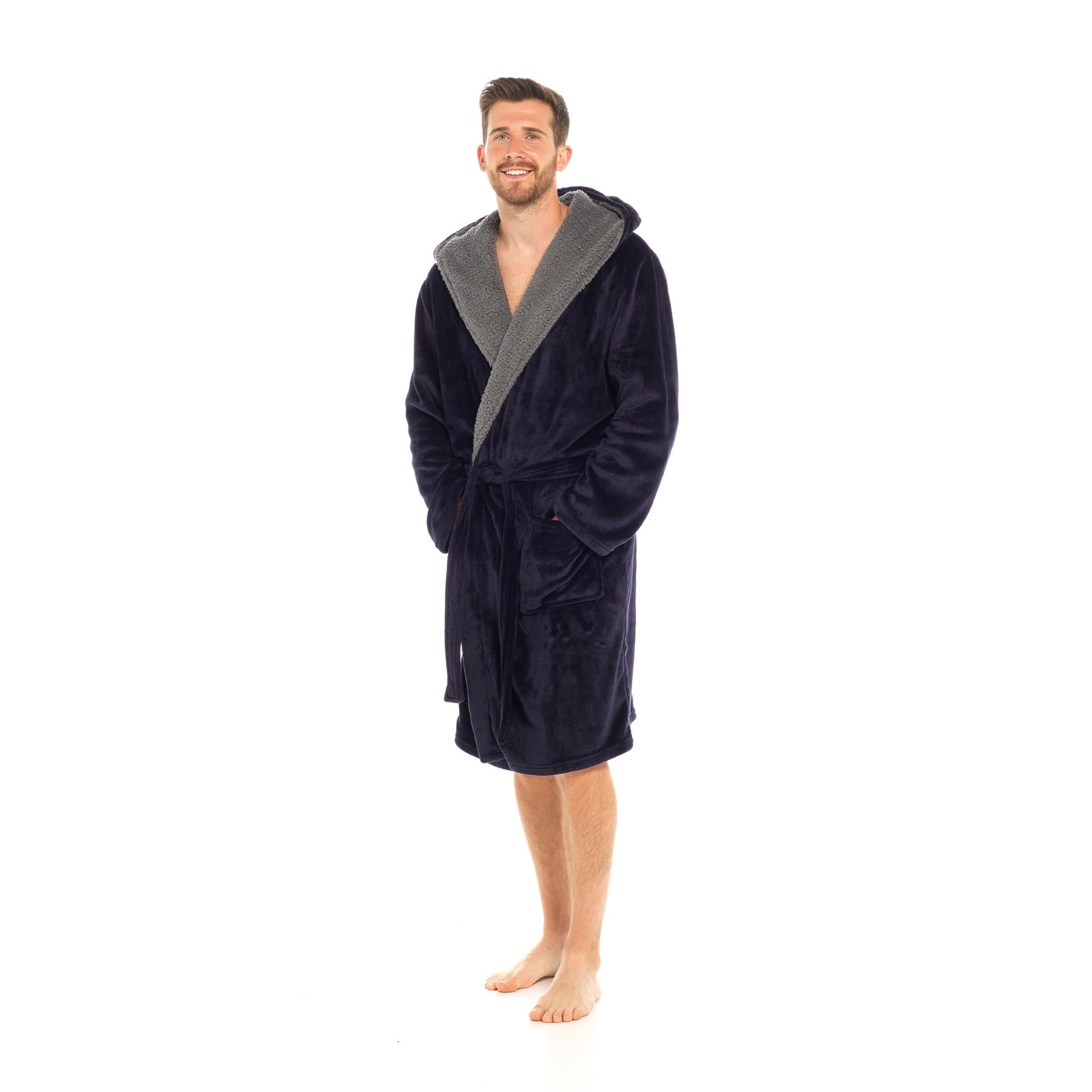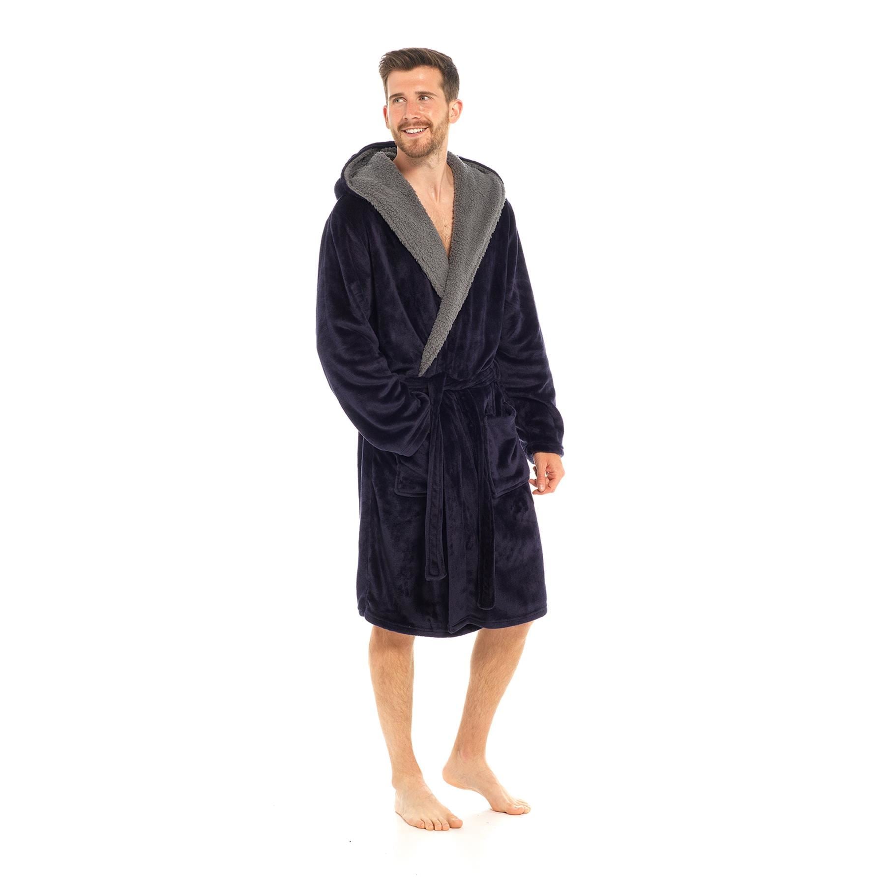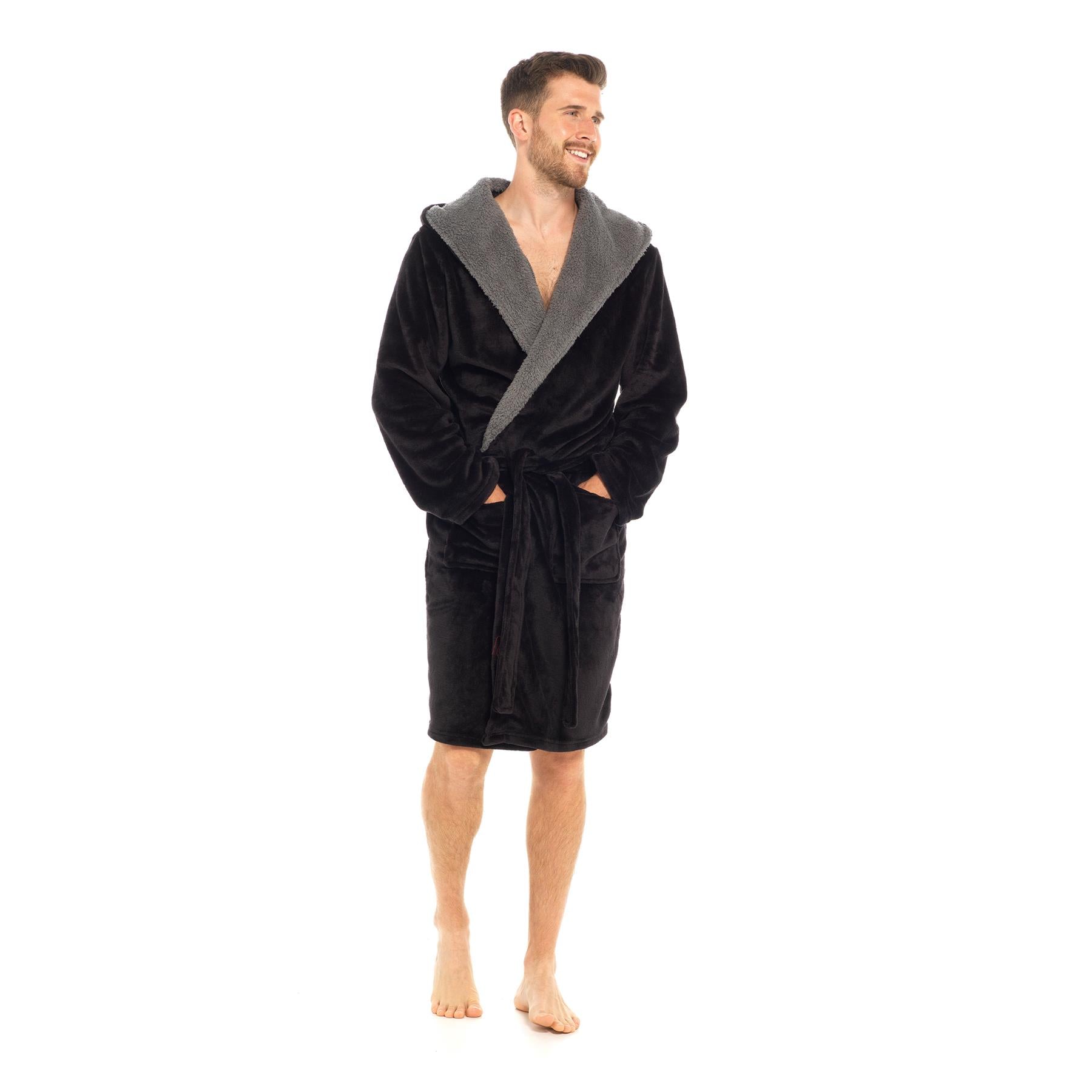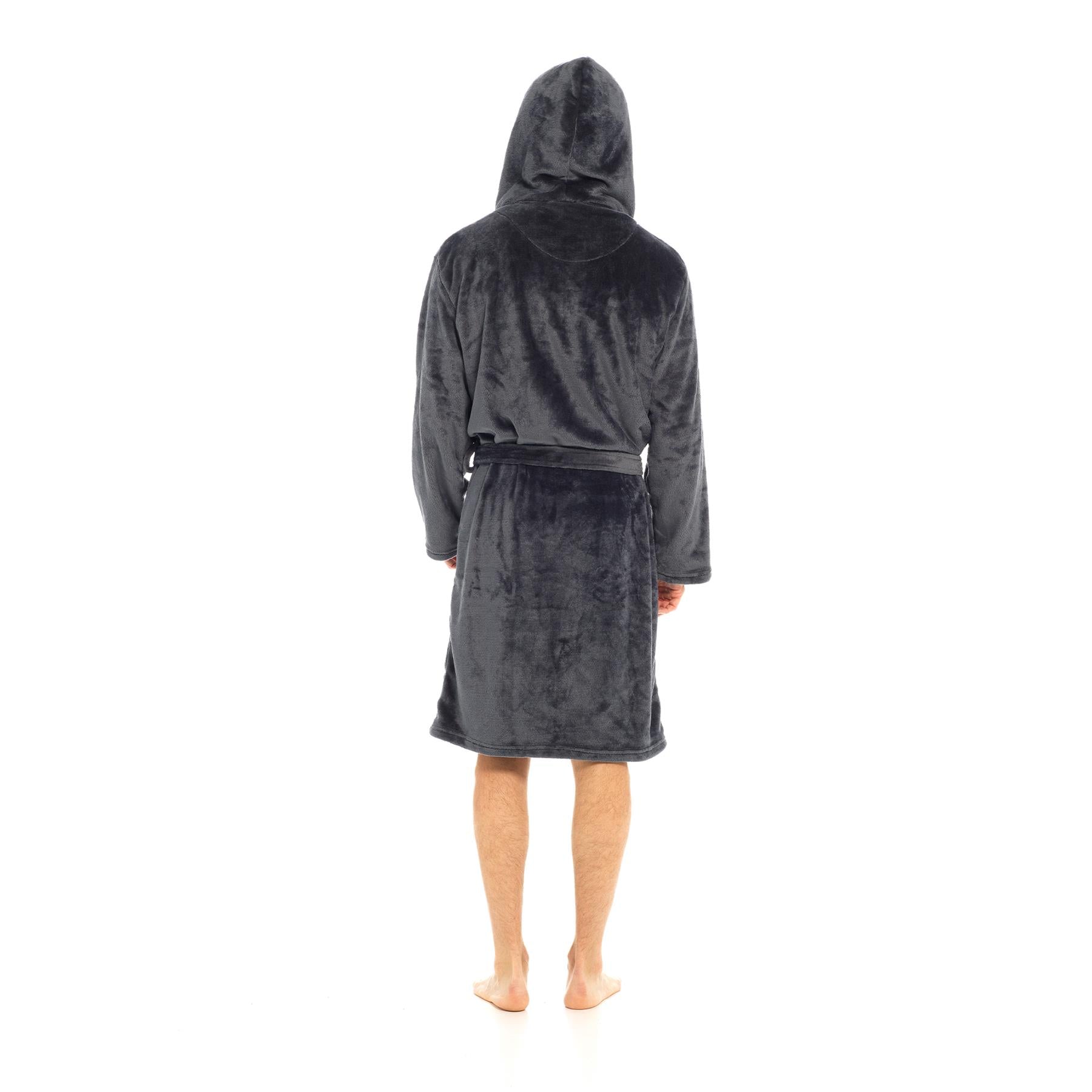Mens Flannel Fleece Hooded Dressing Gown Sherpa Lined Robe with Belt & Pockets