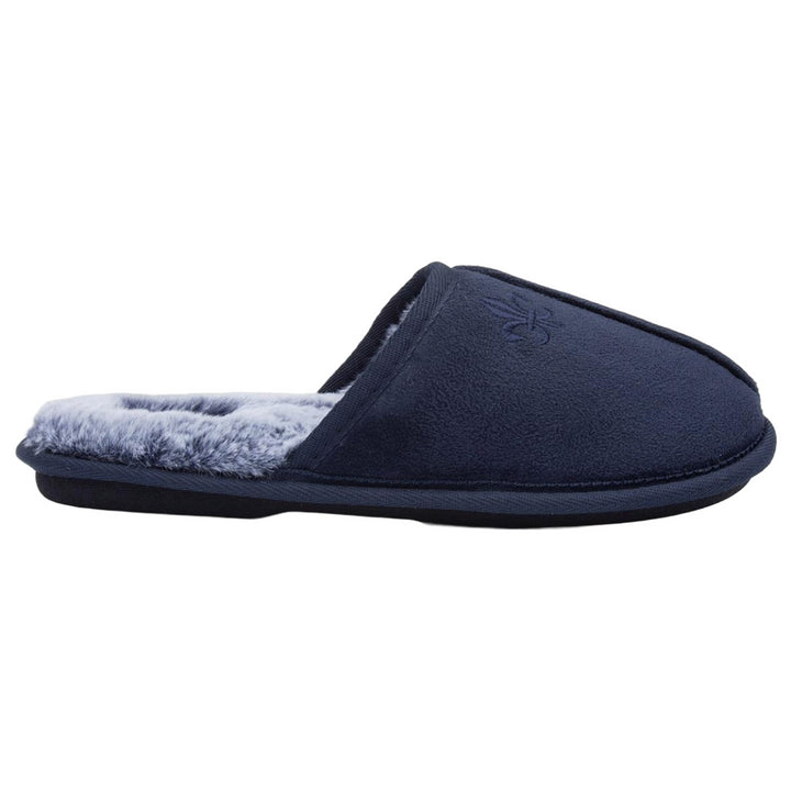 These slippers have a prominent grey and navy lining surrounding the opening. The rounded toe design provides generous space, enhancing overall comfort. -