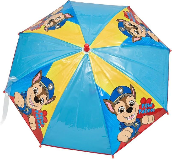 Featuring a cheerful Chase print and bright red, blue, and yellow panels, this Paw Patrol umbrella adds a splash of fun to any rainy day. The curved red handle ensures a comfortable grip, while rounded safety tips help protect your child during use. A perfect accessory for school, holidays, or playtime walks!