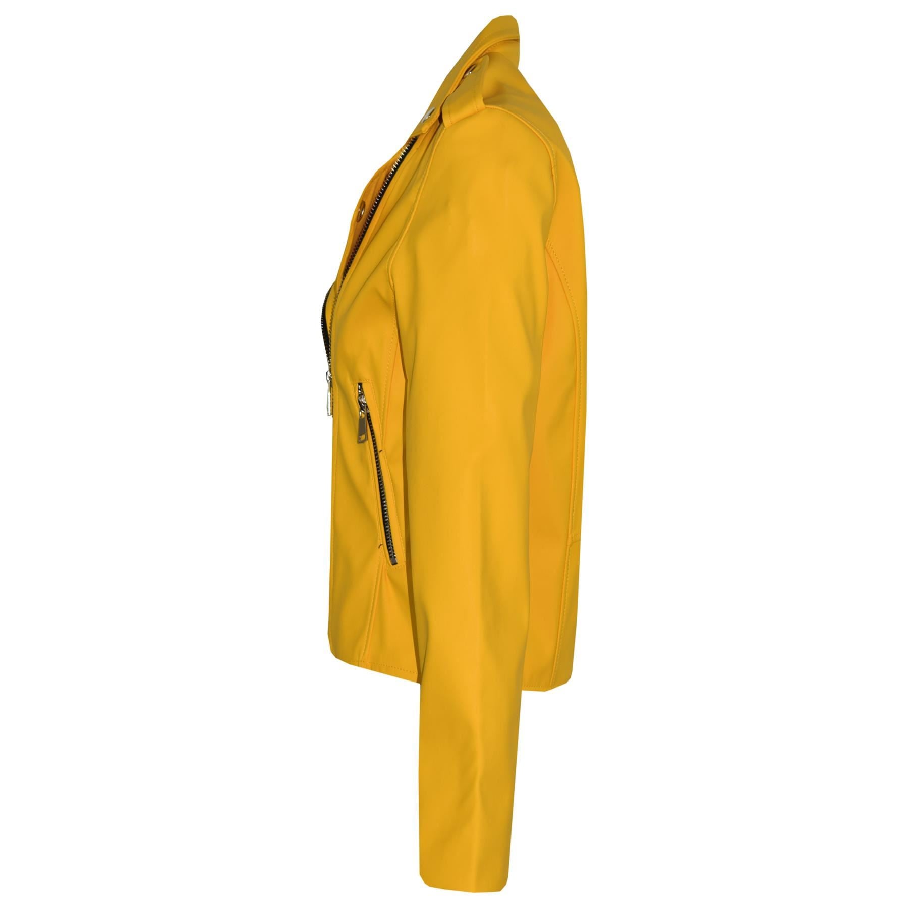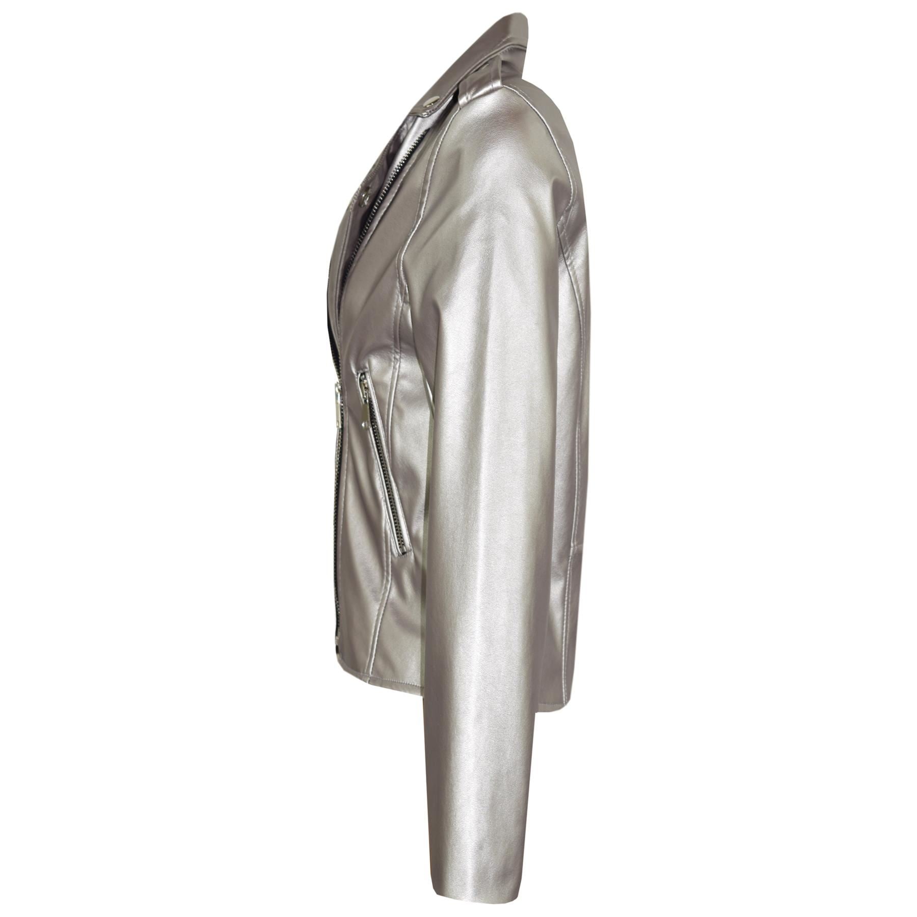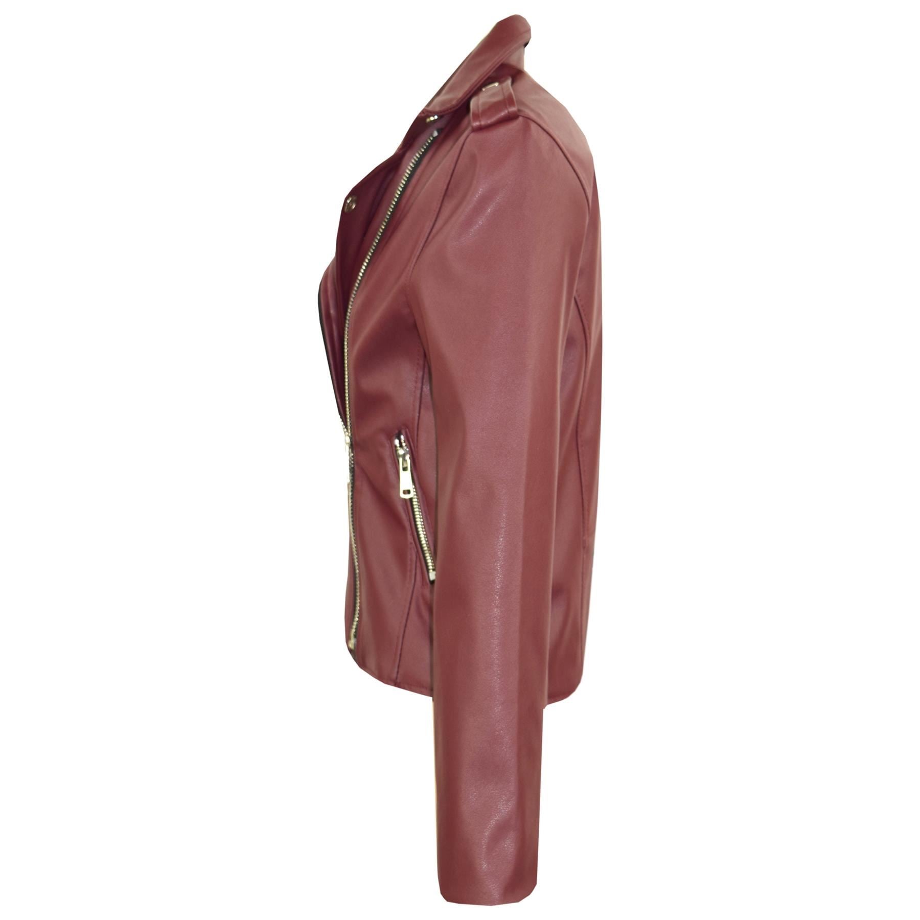 This jacket is made from 100% PU leather with a polyester lining on the inside. It features two side zip pockets and a decorative buttoned flap on the right side. The jacket has a full front zip with button fastenings at the top, as well as buttons on the shoulders and collar. -