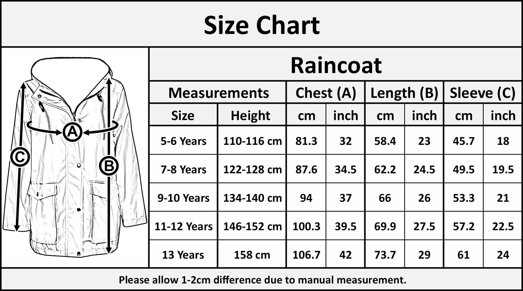 PU Raincoat Jacket Windbreaker Waterproof Parka Hooded Girls Boys Age 5-13 Years