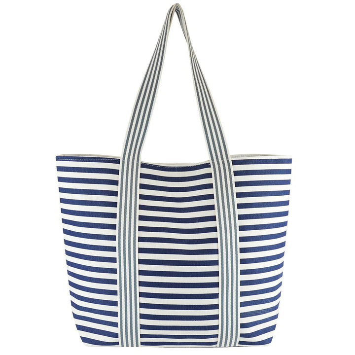 This versatile canvas beach bag comes in blue and white horisontal stripes pattern, The bag features a spacious interior with dimensions of L 50 x W 38 x H 28, providing ample room for your beach essentials, ensuring there is a perfect match for everyone.