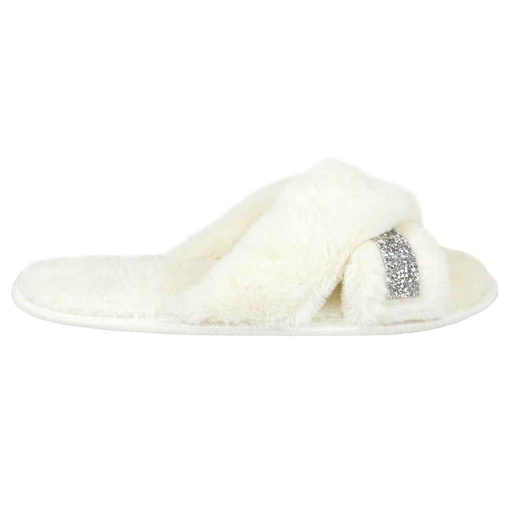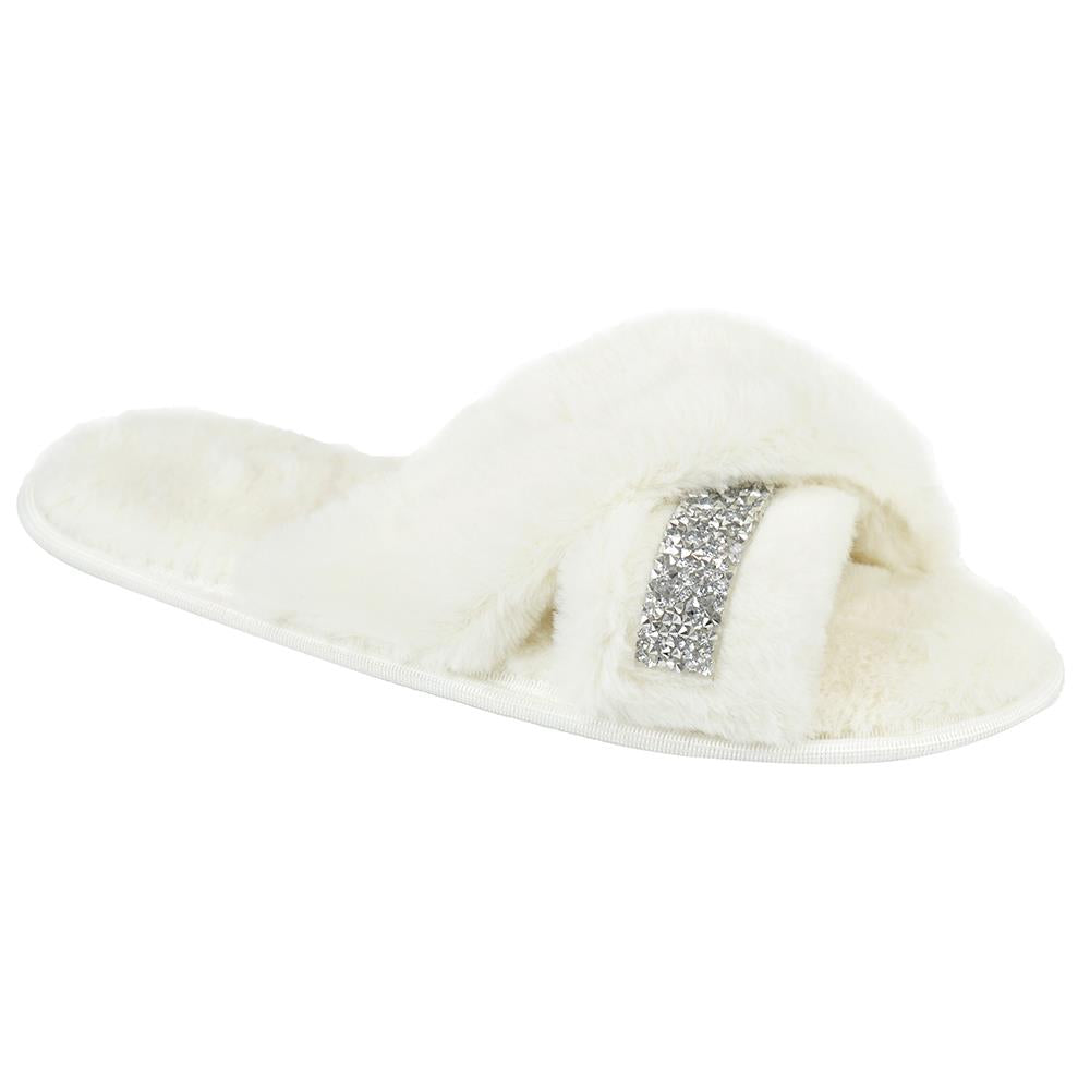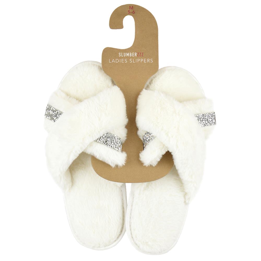 These fluffy slide slippers come in Cream and Cream/Silver with available sizes of 3/4 UK, 5/6 UK, and 7/8 UK.