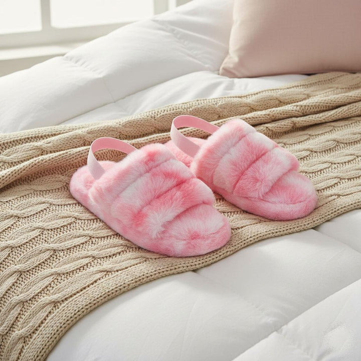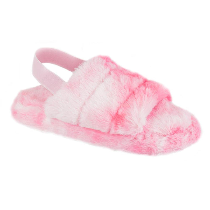 These fluffy slide slippers come in Blue and Tie Dye Pink with available sizes of 3/4 UK, 5/6 UK, and 7/8 UK.
