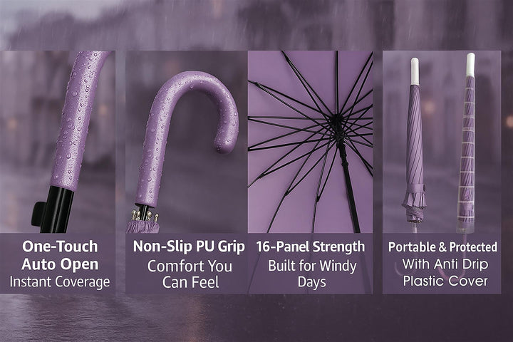 - ? Comfortable PU-Coated J Handle: The classic curved handle offers a stylish silhouette and a secure grip — great for long walks, travel, and everyday errands.