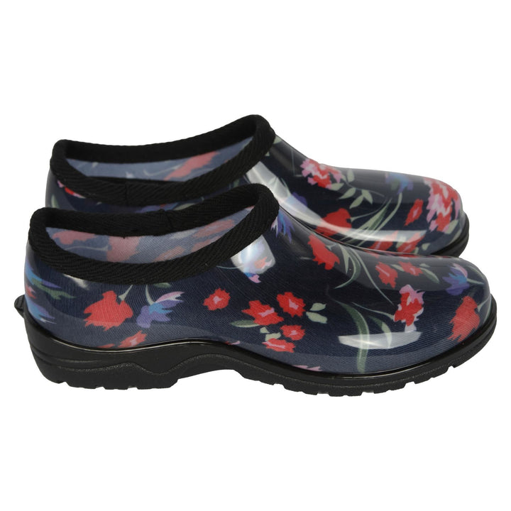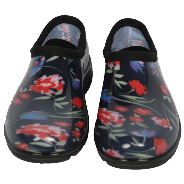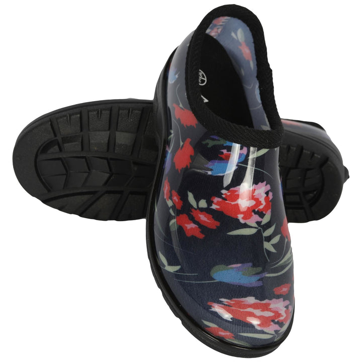 Add a pop of colour to rainy days with the vibrant floral print design set against a deep black background. Perfect for women who love combining functionality with a fashionable look, whether in the garden, outdoors, or for casual errands. -