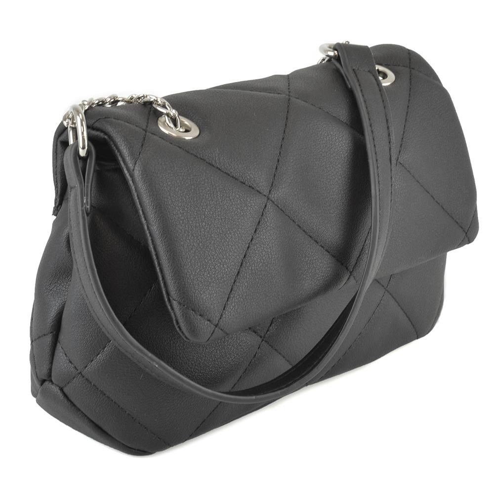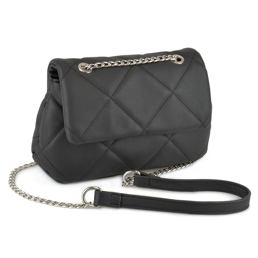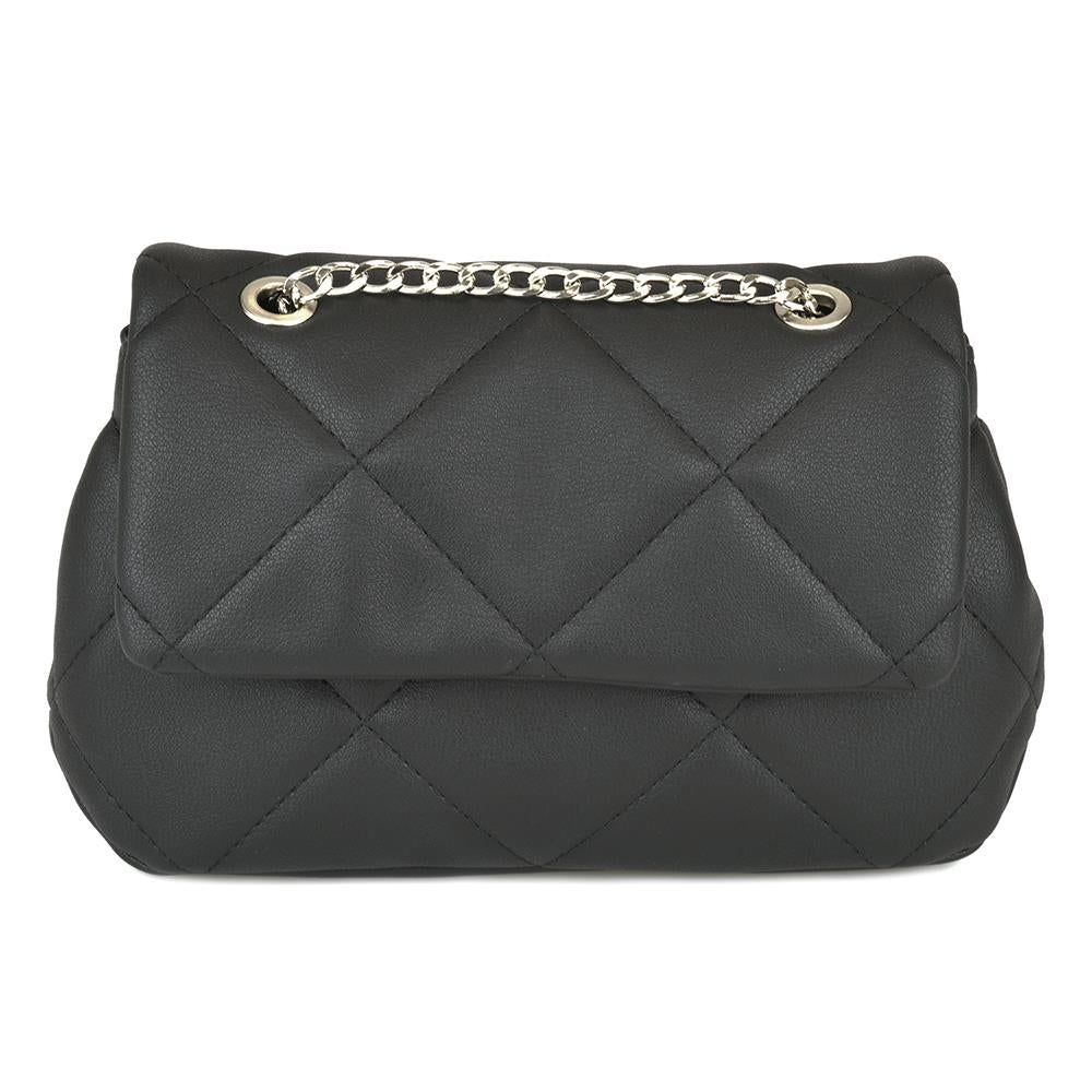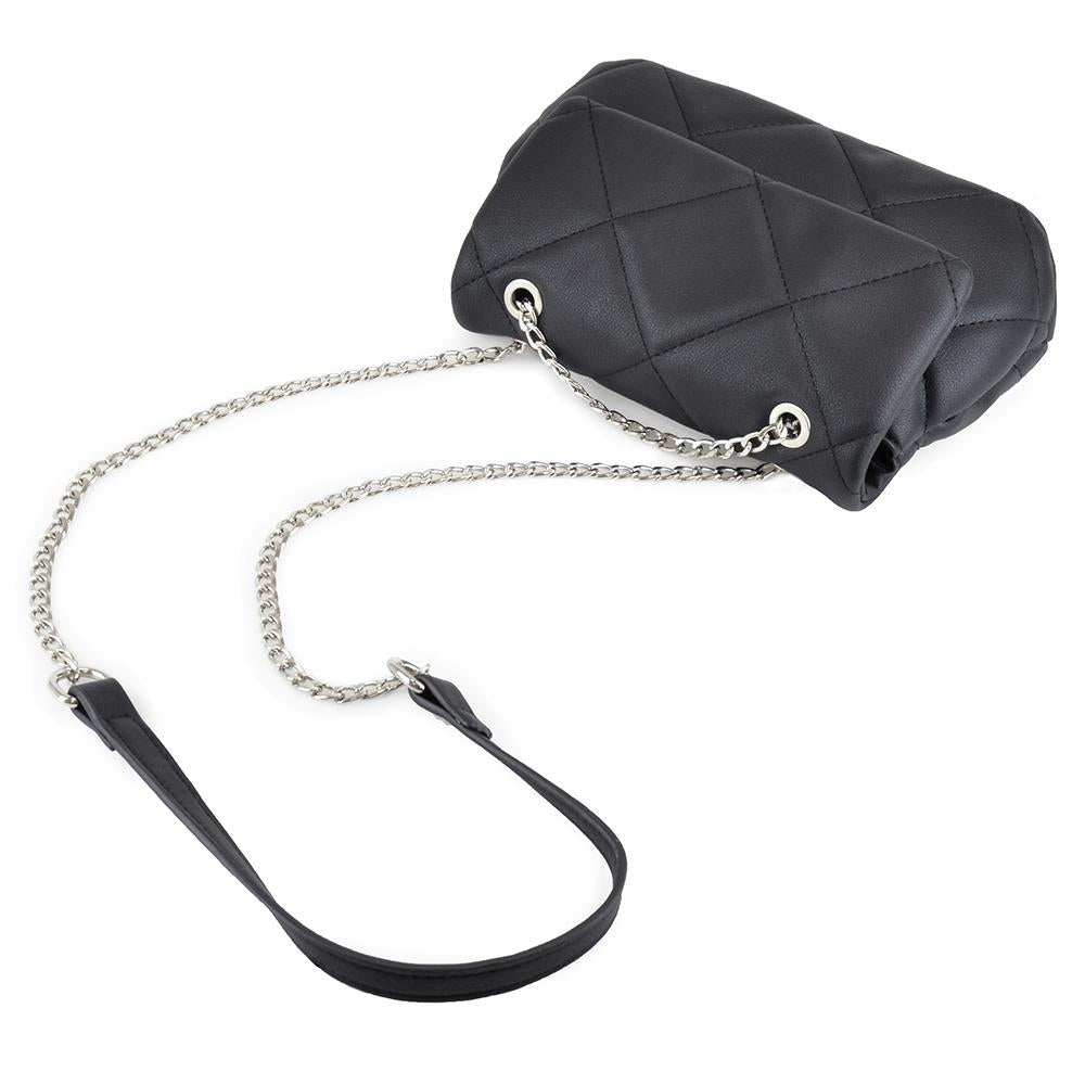 This elegant quilted black faux leather handbag is a versatile and sophisticated accessory for any ensemble. It is furnished with an adjustable silver-hued metallic chain strap, a magnetic fastening, and an internal zipped pocket, allowing it to function as both a shoulder bag and a clutch.